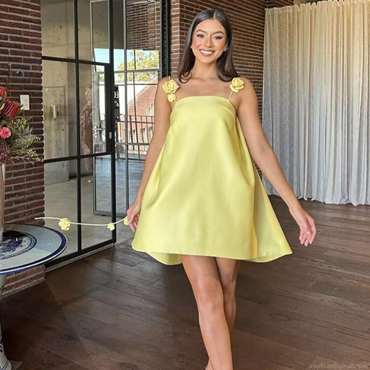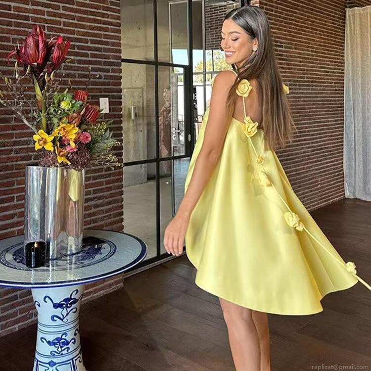 • Women Elegant Yellow Satin Camisole Dress With 3D Flower Decoration V-Neck A-Line Mini Dress For Party Summer Vacation Celebrity Style Lady Clothing