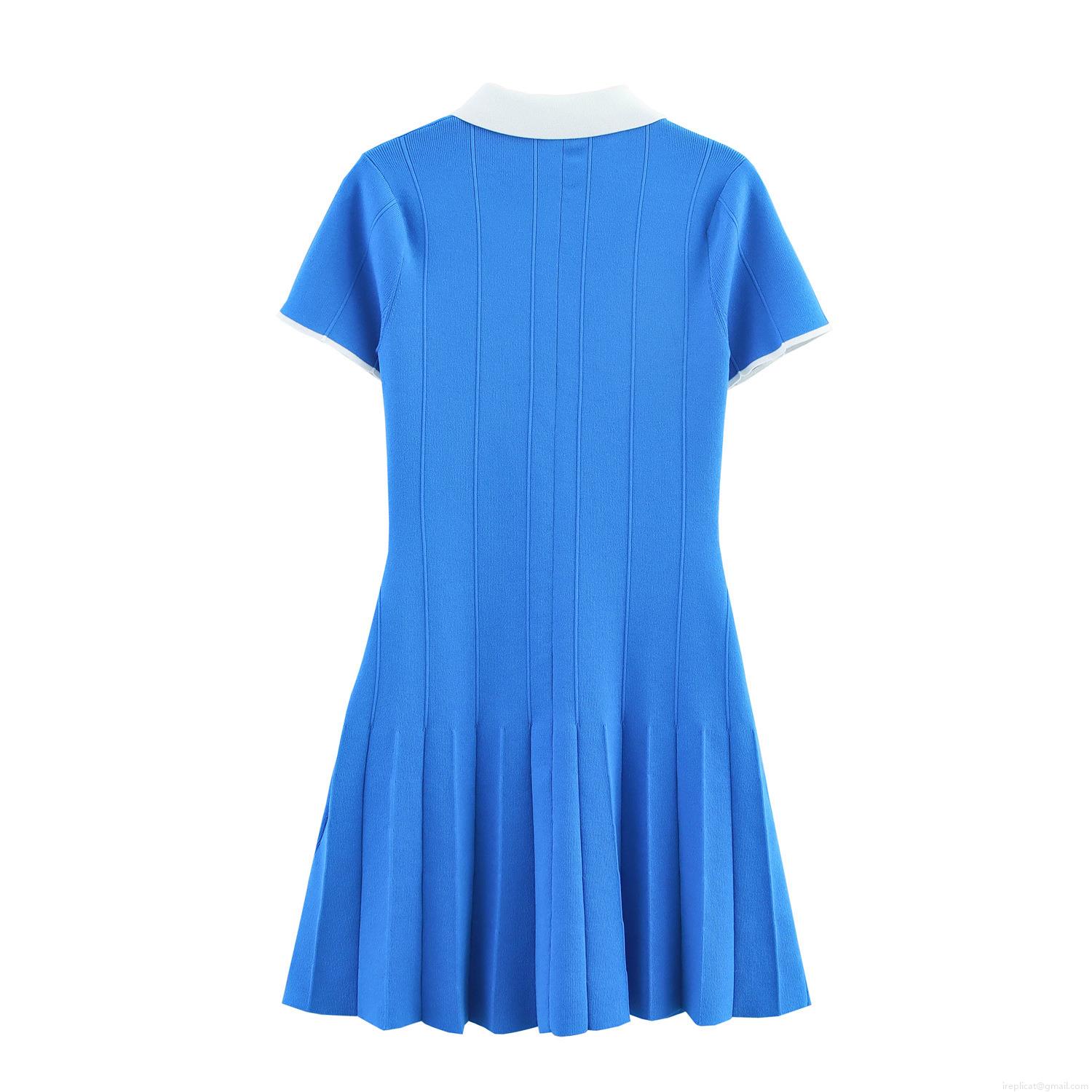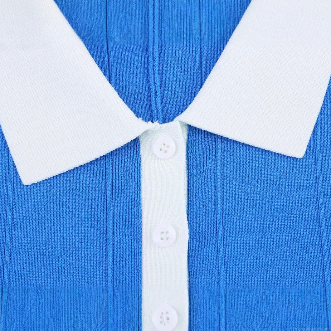 Women Fashion Contrast Color Knitted Polo Dress Short Sleeve Pleated Hem Mini Dress Summer Casual Elegant Bodycon Sweater Dress For Ladies