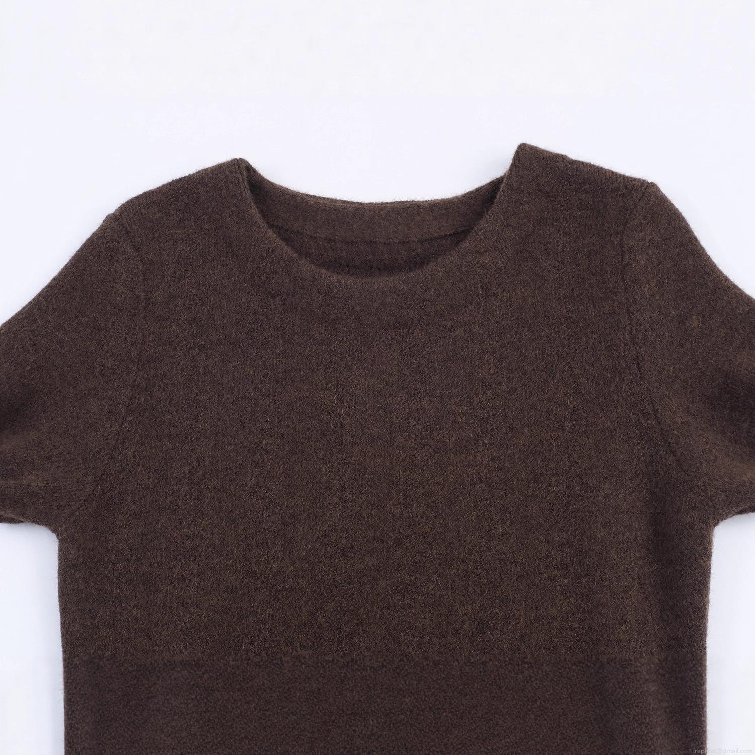 Women Fashion Faux Fur Patchwork Knit Dress Round Neck Short Sleeve Solid Color Slim Fit Midi Pencil Dress for Party Socialite Autumn Winter Style