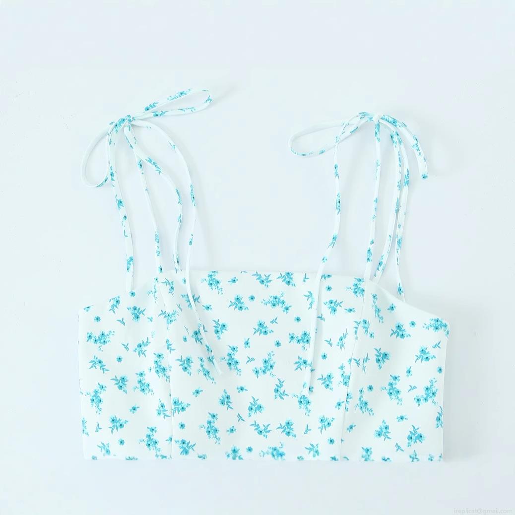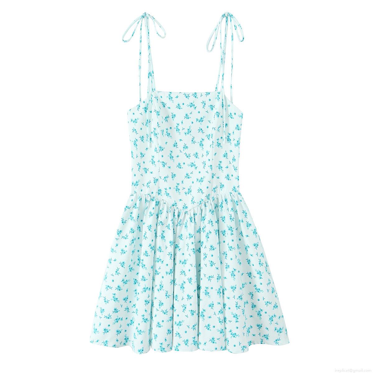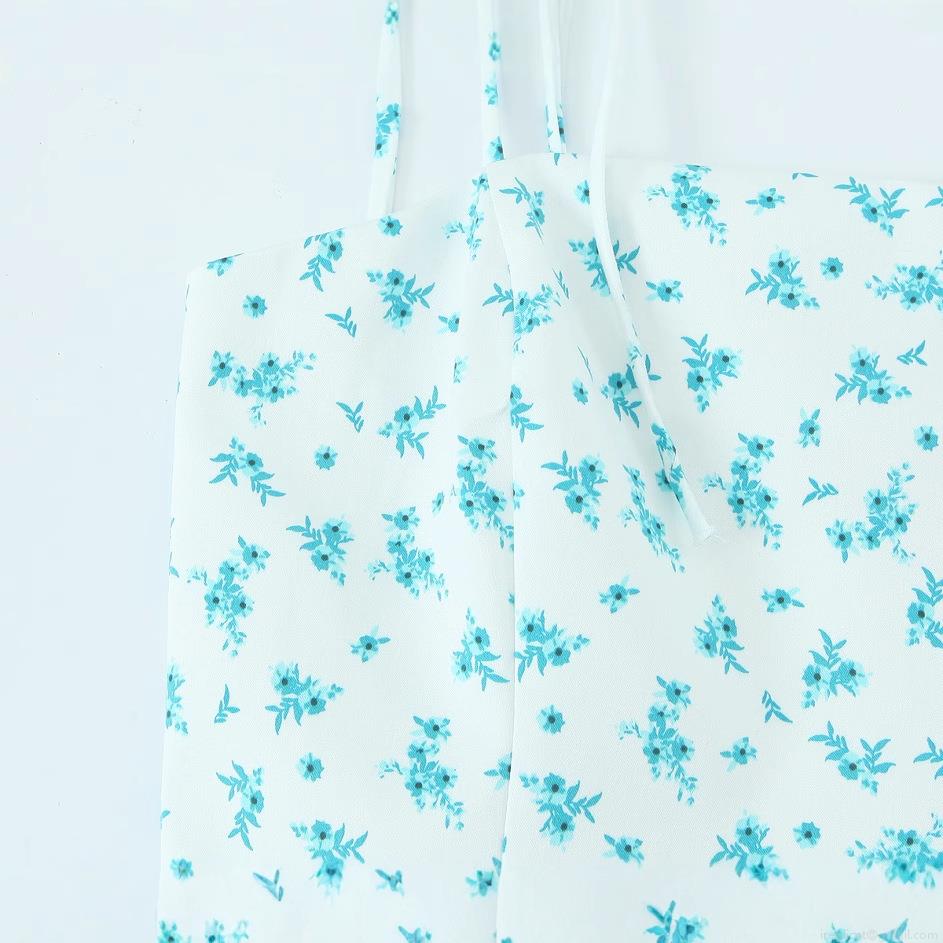 Little Blue Flower, Floral Pattern, Square Collar, Strapless Shoulder Strap, Pleated Skirt
