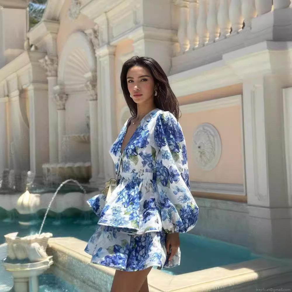 Ruffles, Plants And Flowers, Printing, Zipper, Hydrangea, Puff Sleeves, Layered Skirt
