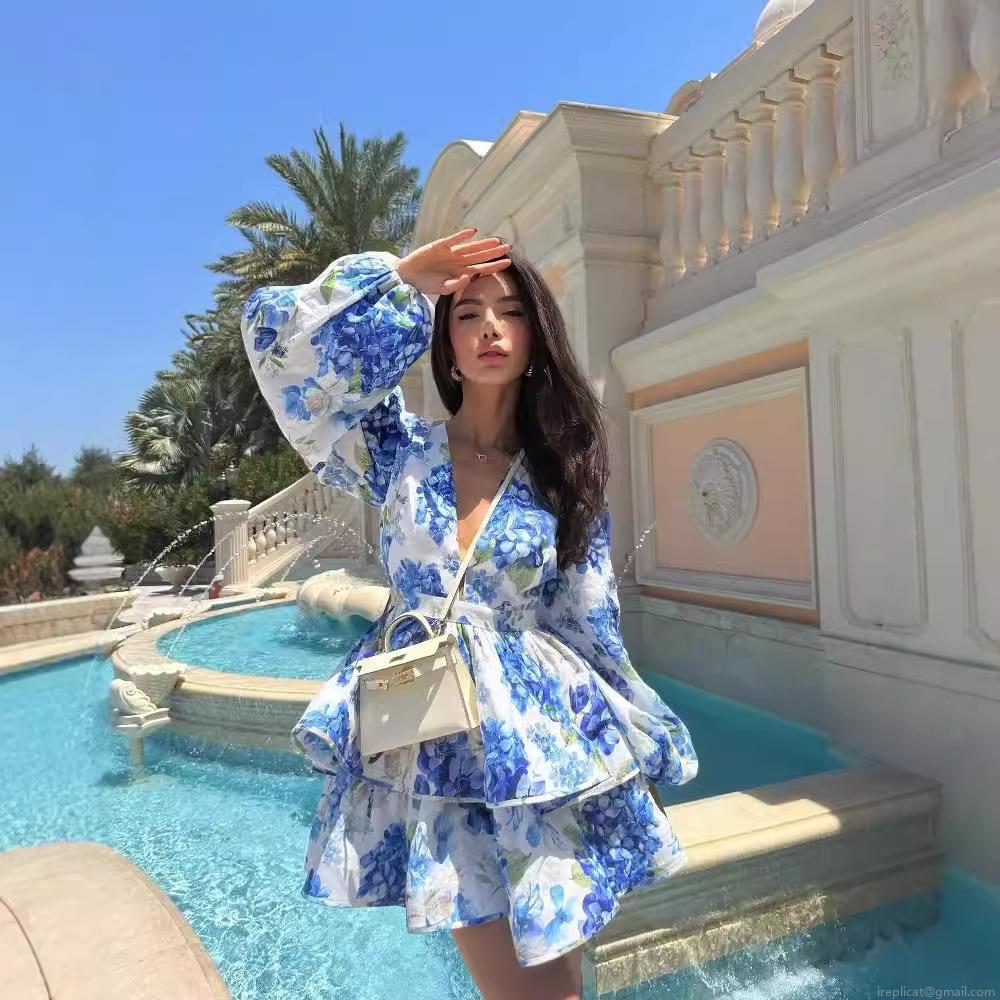 Women Floral Print Mini Dress Polyester V-Neck Long Sleeve Layered Ruffle Hem Dress For Summer Vacation Fresh Sweet Style Elegant Lady Dress