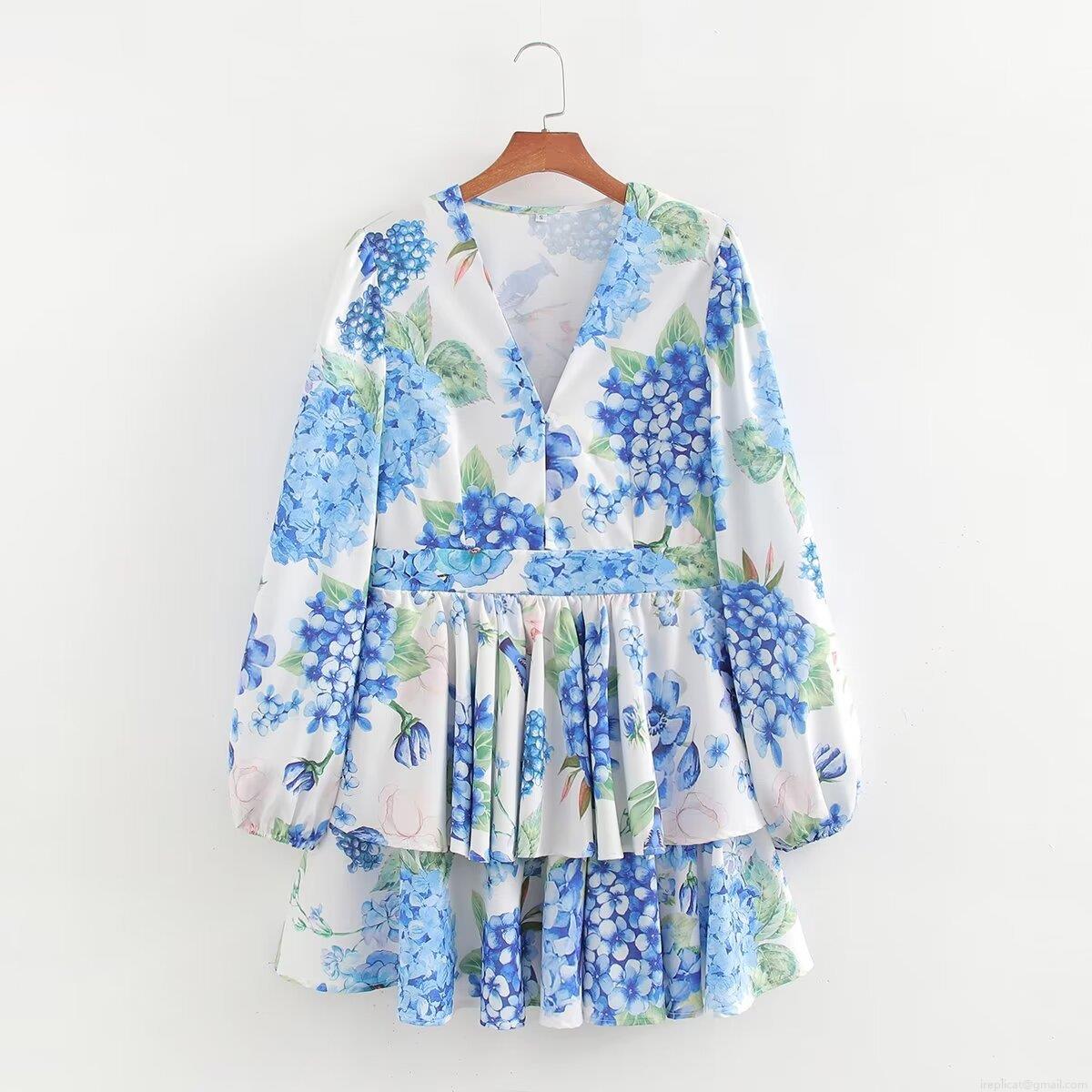 • Women Floral Print Mini Dress Polyester V-Neck Long Sleeve Layered Ruffle Hem Dress For Summer Vacation Fresh Sweet Style Elegant Lady Dress