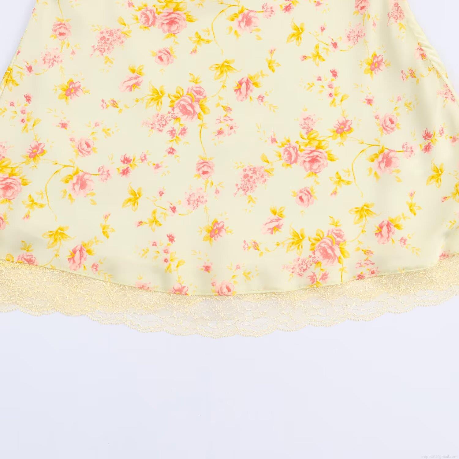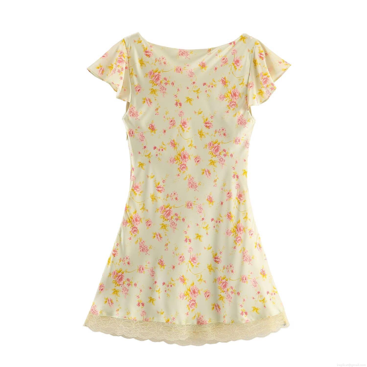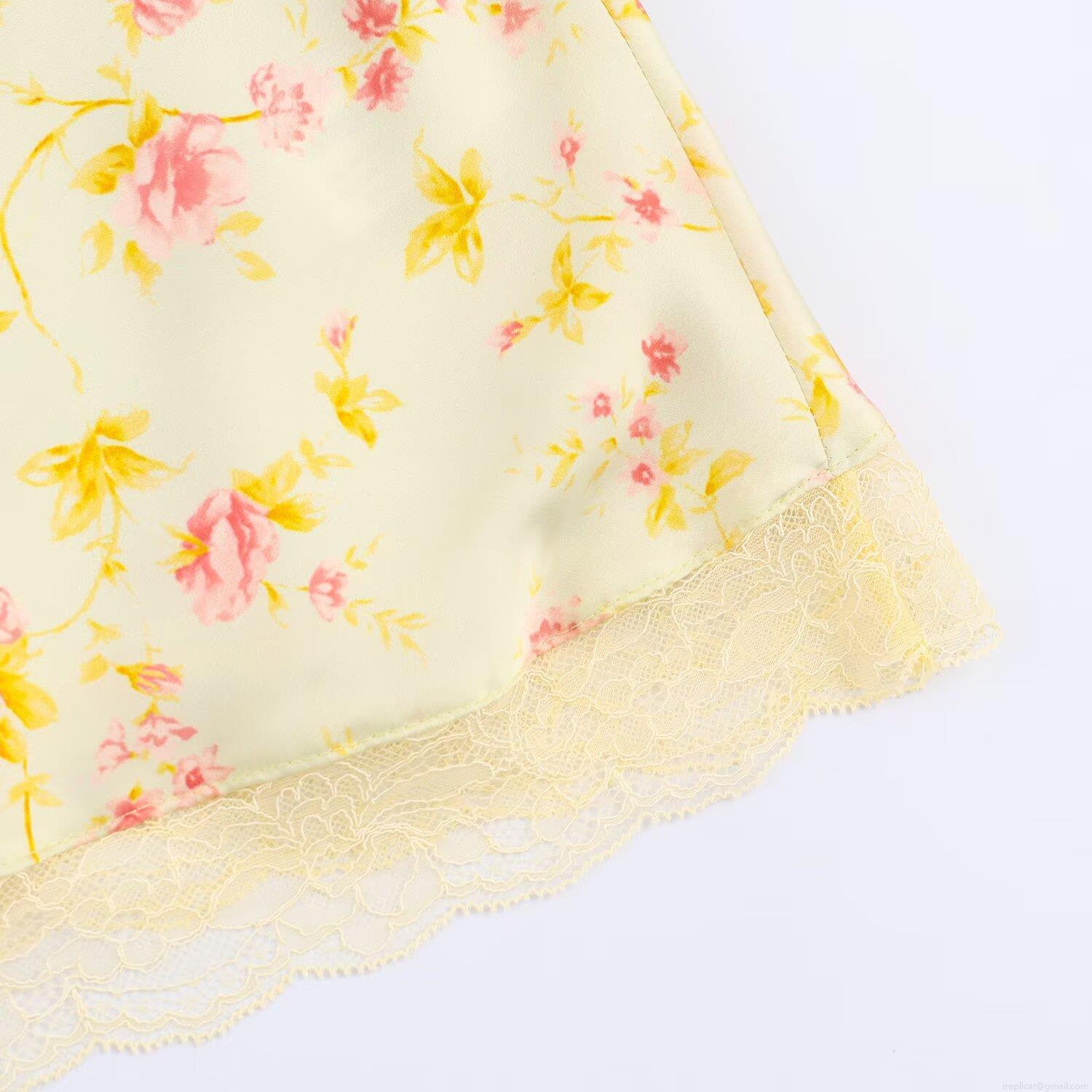 • Women Floral Print Mini Dress Satin Silk Texture Lace Patchwork Hem Ruffle Butterfly Sleeve V Neck Slim Fit Sexy Party Club Elegant Fashion Clothing