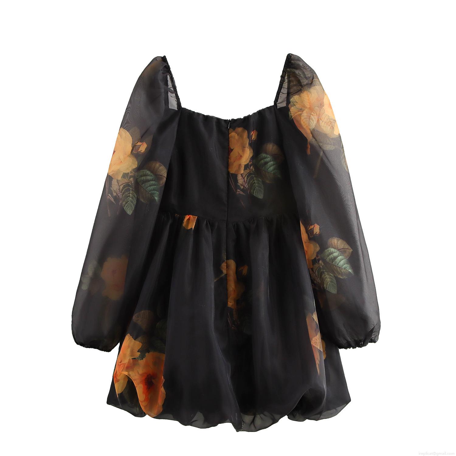 • Women Floral Print Organza Mini Dress Square Neck Long Mesh Sleeve Sweet Party Short Dress Elegant Sexy Bodycon High Waist Dress For Date Party