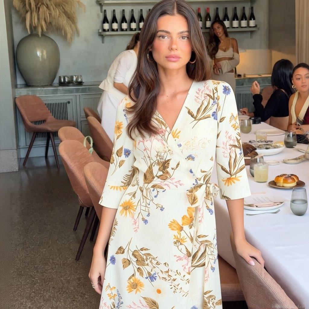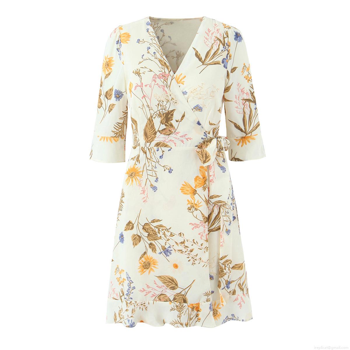 • Women Floral V-Neck Wrap Dress Ruffle Tie Waist Polyester Summer Half Sleeve French Style Casual Party Beach Boho Flowy Mini Dress