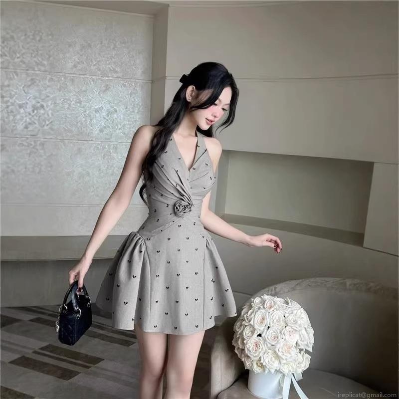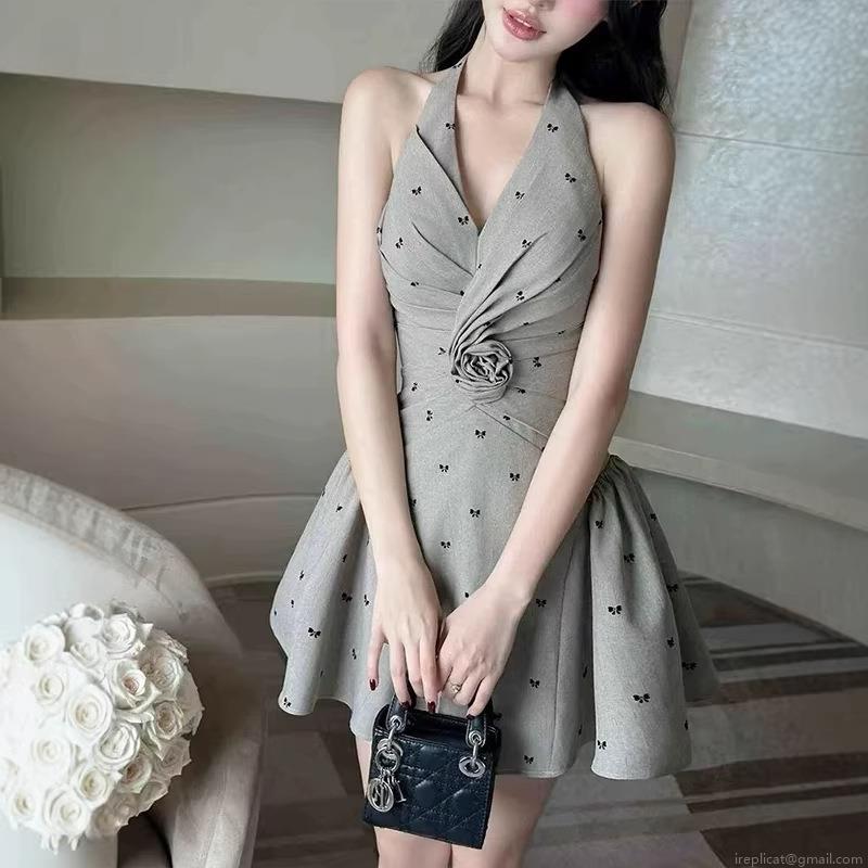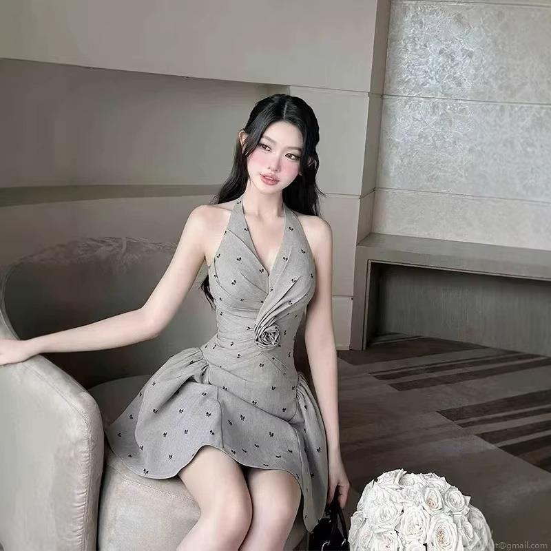 • Women French Chic Sexy Halter Mini Dress With 3D Rose Flower Butterfly Print Backless Slim Fit Short Dress For Summer Party Vacation