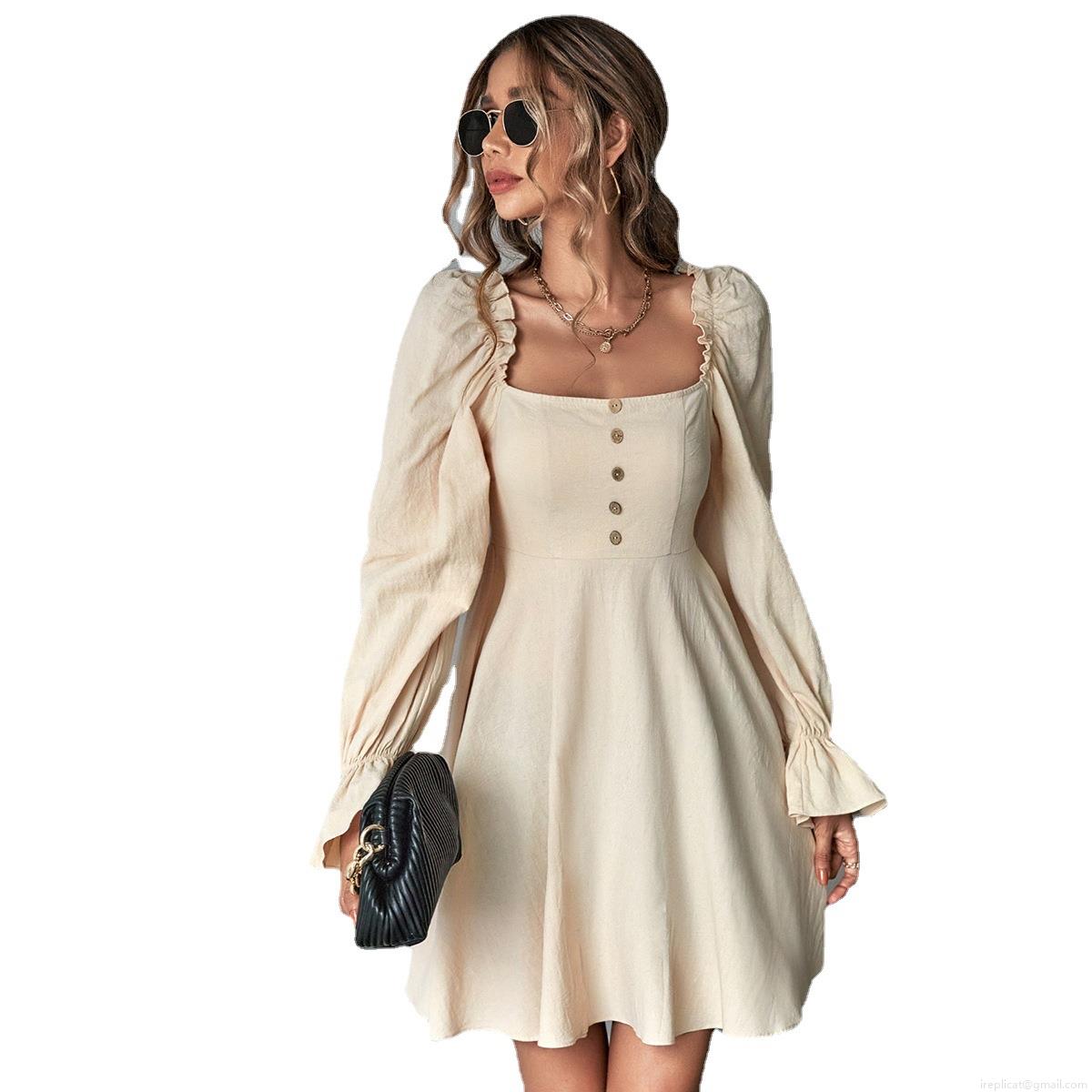 • Women French Retro Square Neck Long Puff Sleeve Mini Dress 100% Cotton Solid Color Button Front A-Line Short Dress For Casual Vacation Party Elegant Ladies Summer Apparel