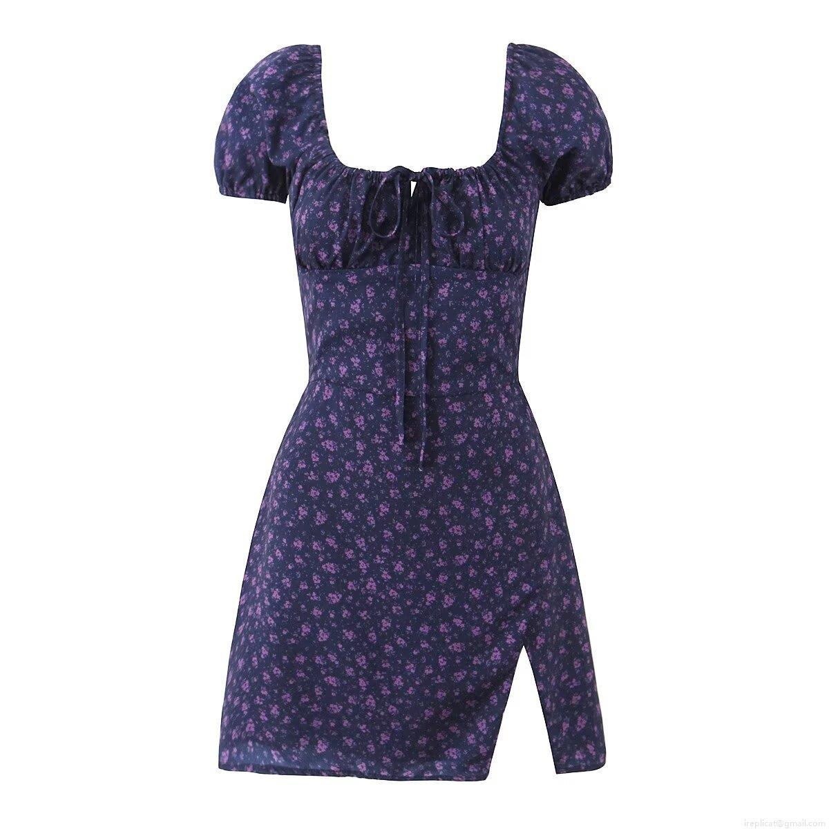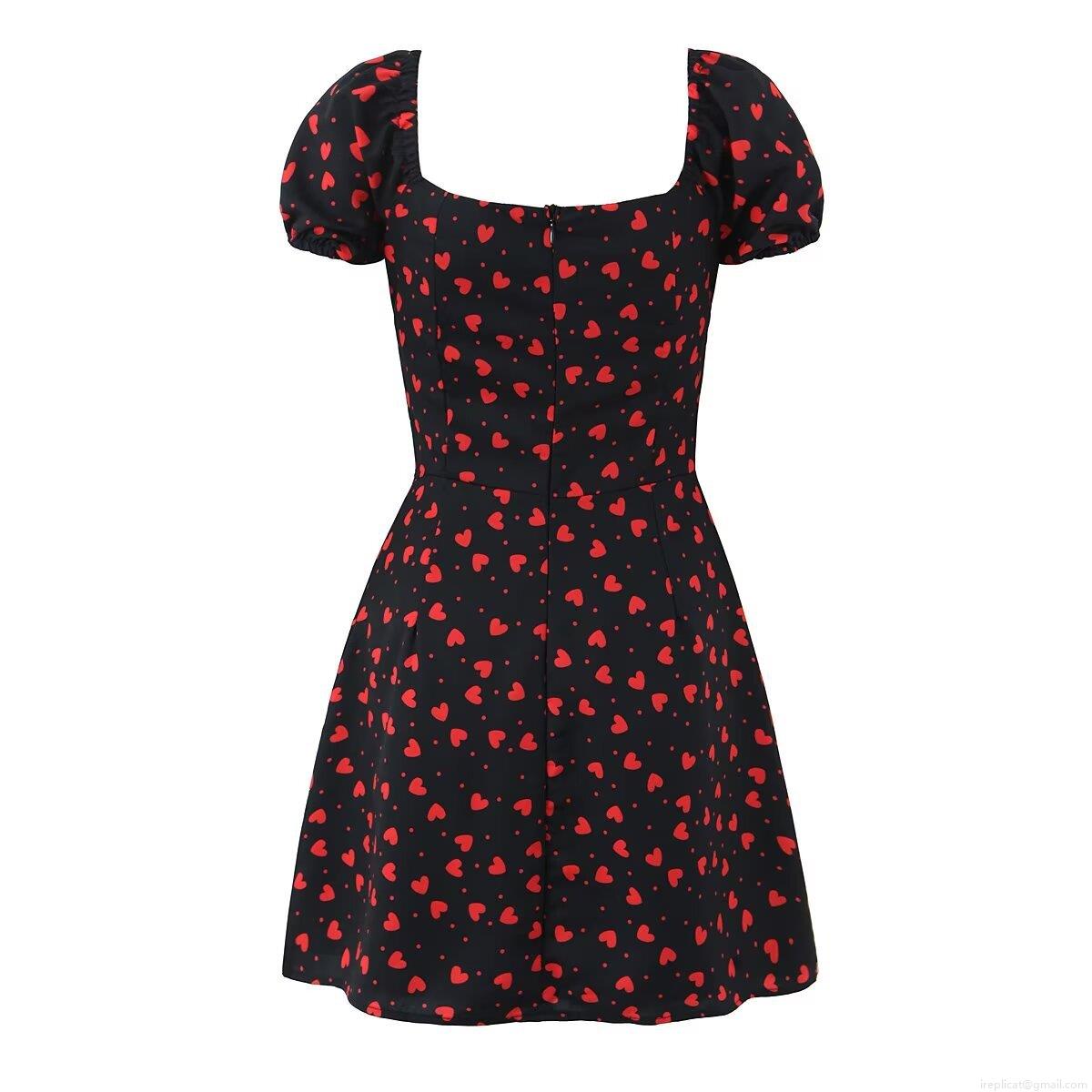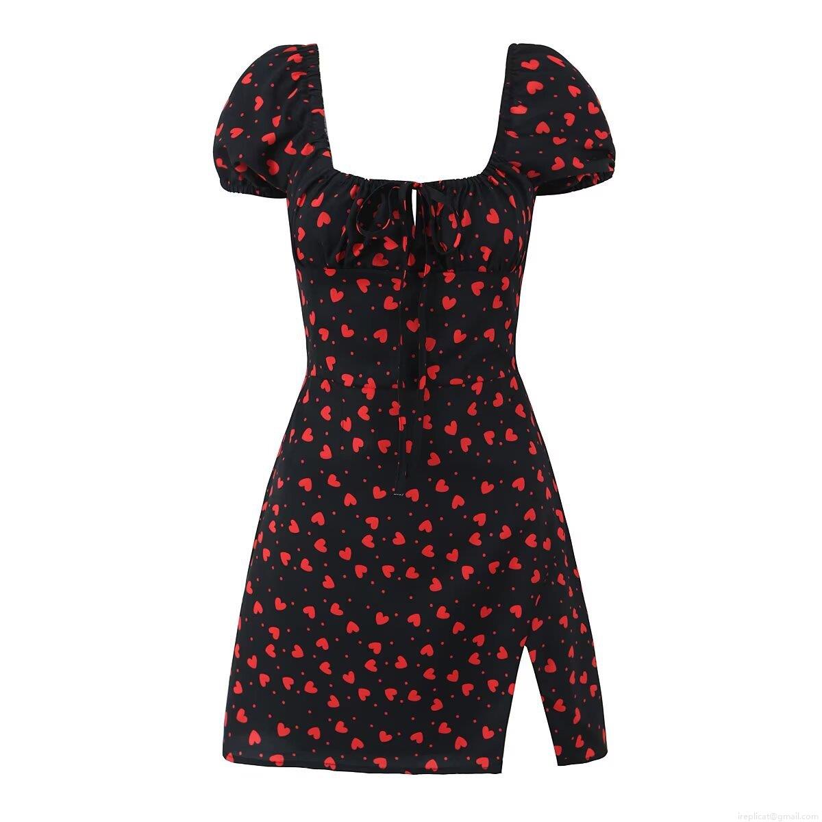 • Women French Square Neck Mini Dress Summer Puff Sleeve Floral Heart Print Drawstring Side Slit Slim Fit A-Line Short Dress For Vacation Casual Party