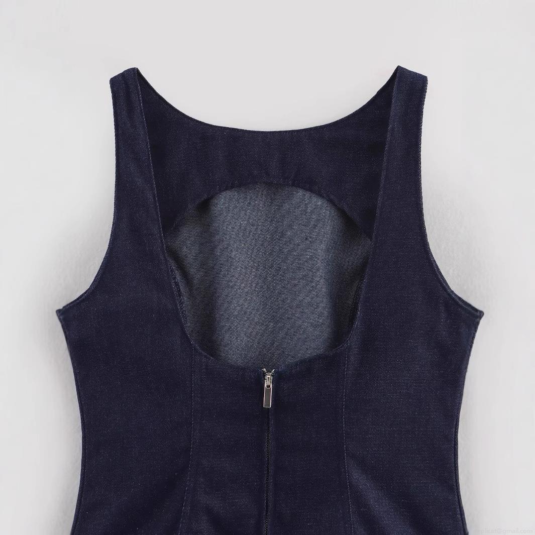 • Women French Style Dark Blue Denim Texture Backless Mini Dress Sleeveless U-Neck Slim Fit A-Line Pleated Dress For Summer Party Date Daily Lady Wear
