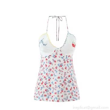 • Women French Sweet Sexy V Neck Halter Floral Mini Dress Scalloped Edge Backless Polyester Blend Sleeveless Summer Beach Holiday Dress