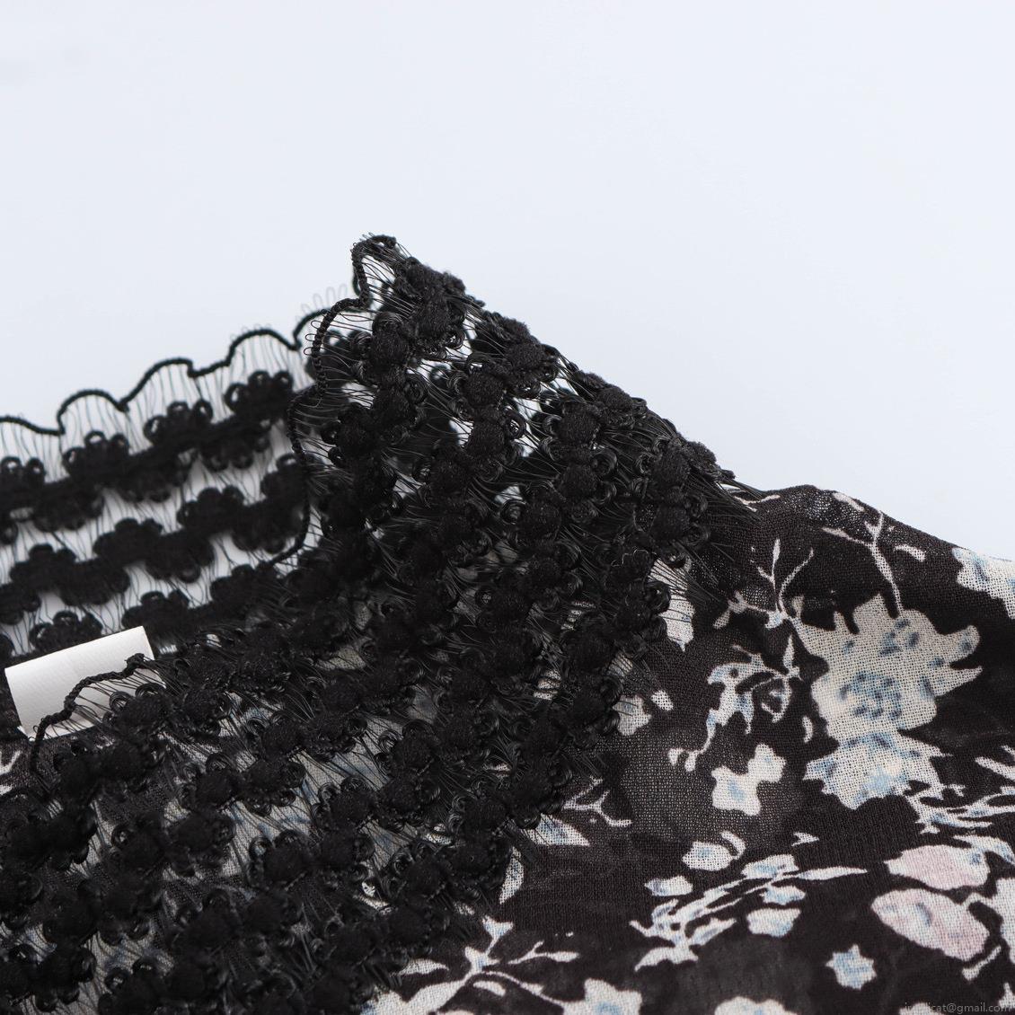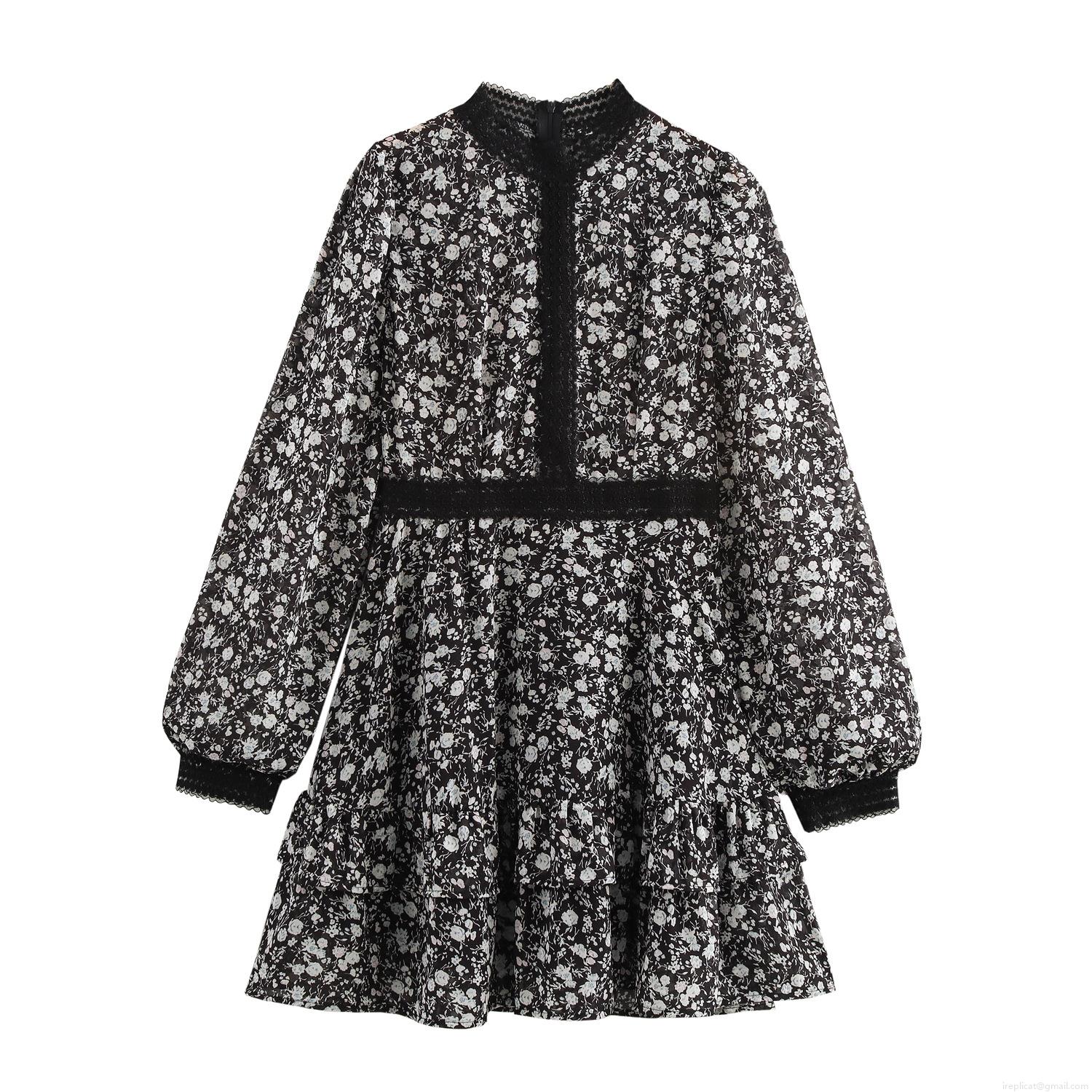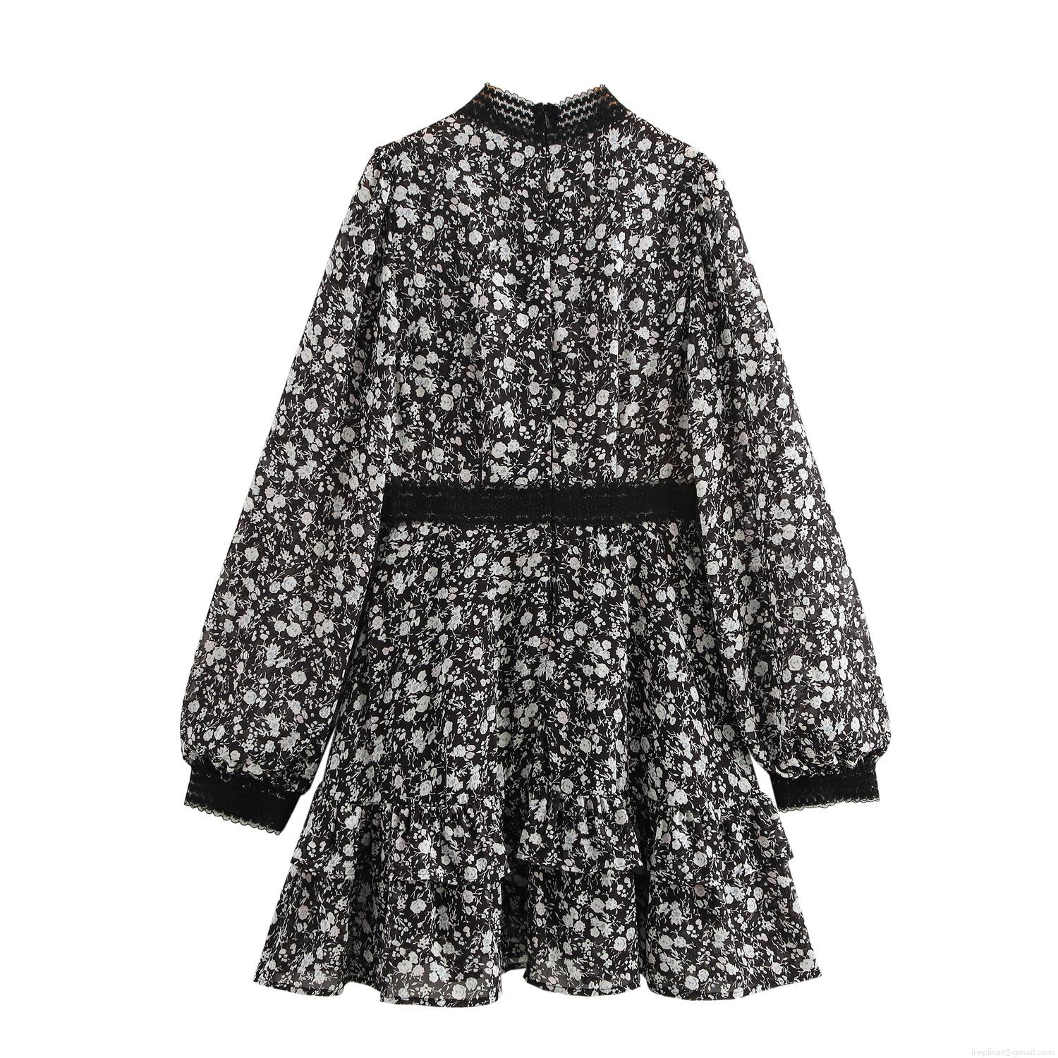 • Women French Vintage Floral Chiffon Mini Dress Elegant Mock Neck Long Sleeve Lace Patchwork Ruffle Hem High Waist Short Dress For Daily Dating