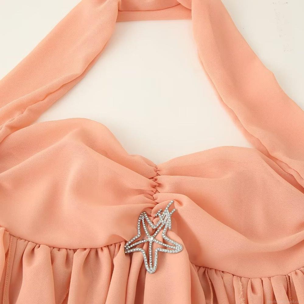 • Women Halter Chiffon Mini Dress With Star Rhinestone Patchwork Ruffle Tiered Skirt Summer Sexy Pure Desire Style Party Vacation Dress