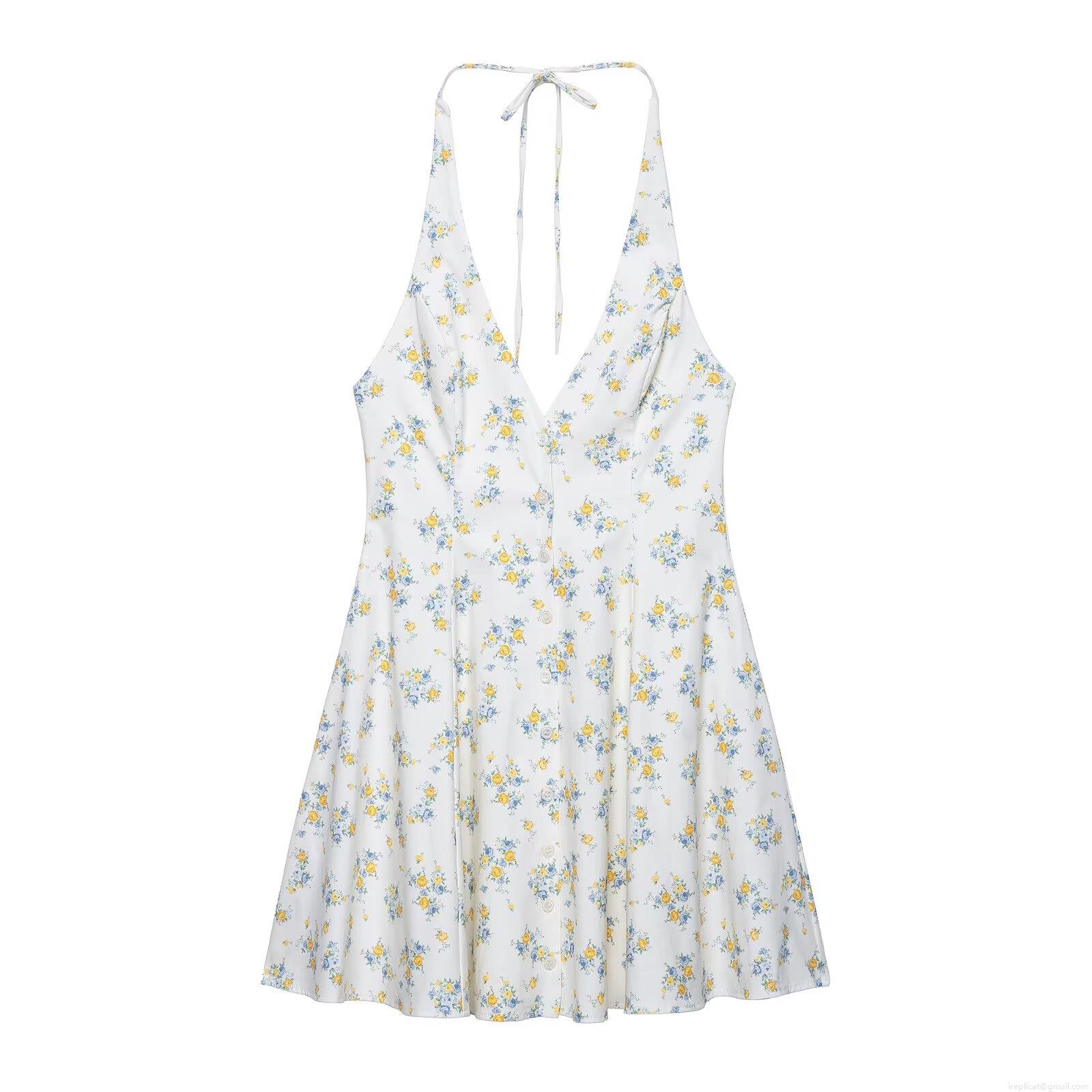 Women Halter Neck Backless Floral Print Mini Dress Sexy Lace-up V-neck A-line Summer Sundress Streetwear Short Dress
