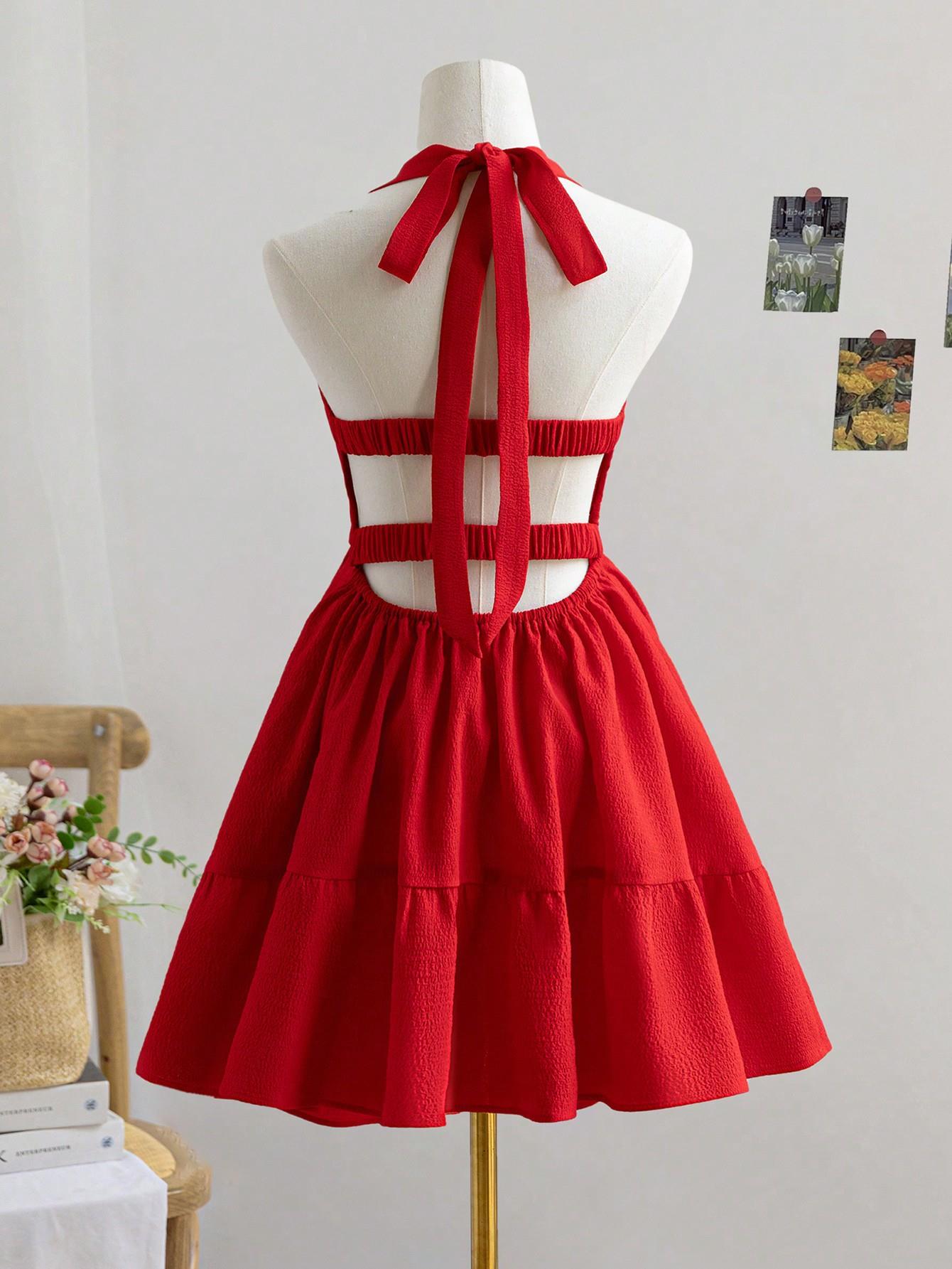 Solid Color, Hollow Out, Knot, Neckband, Backless, Wrinkled Texture