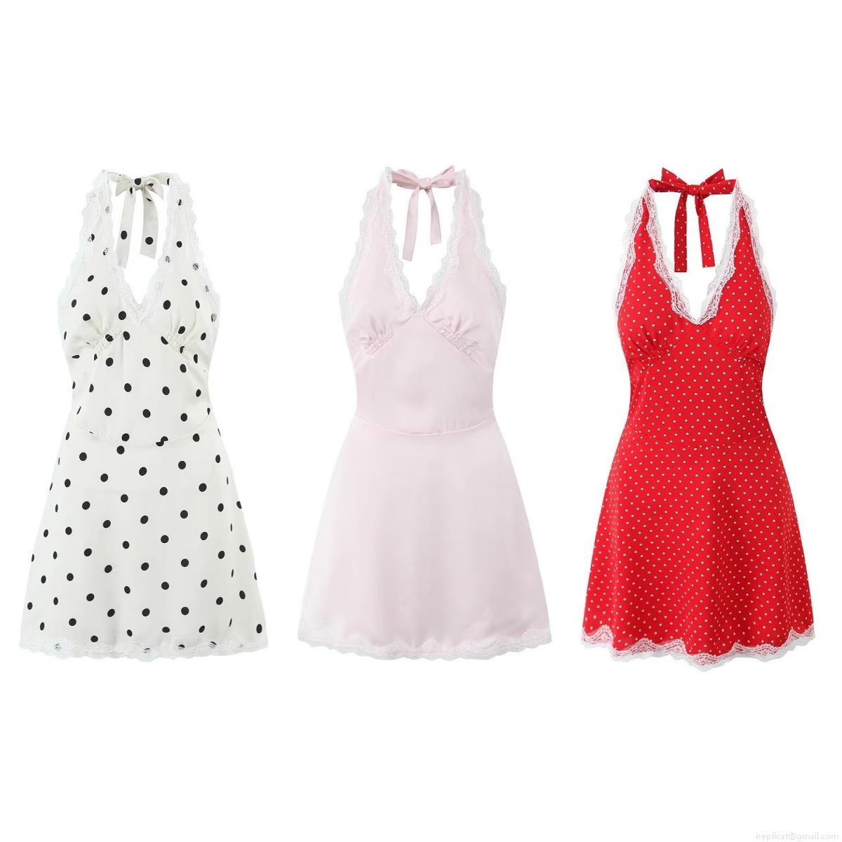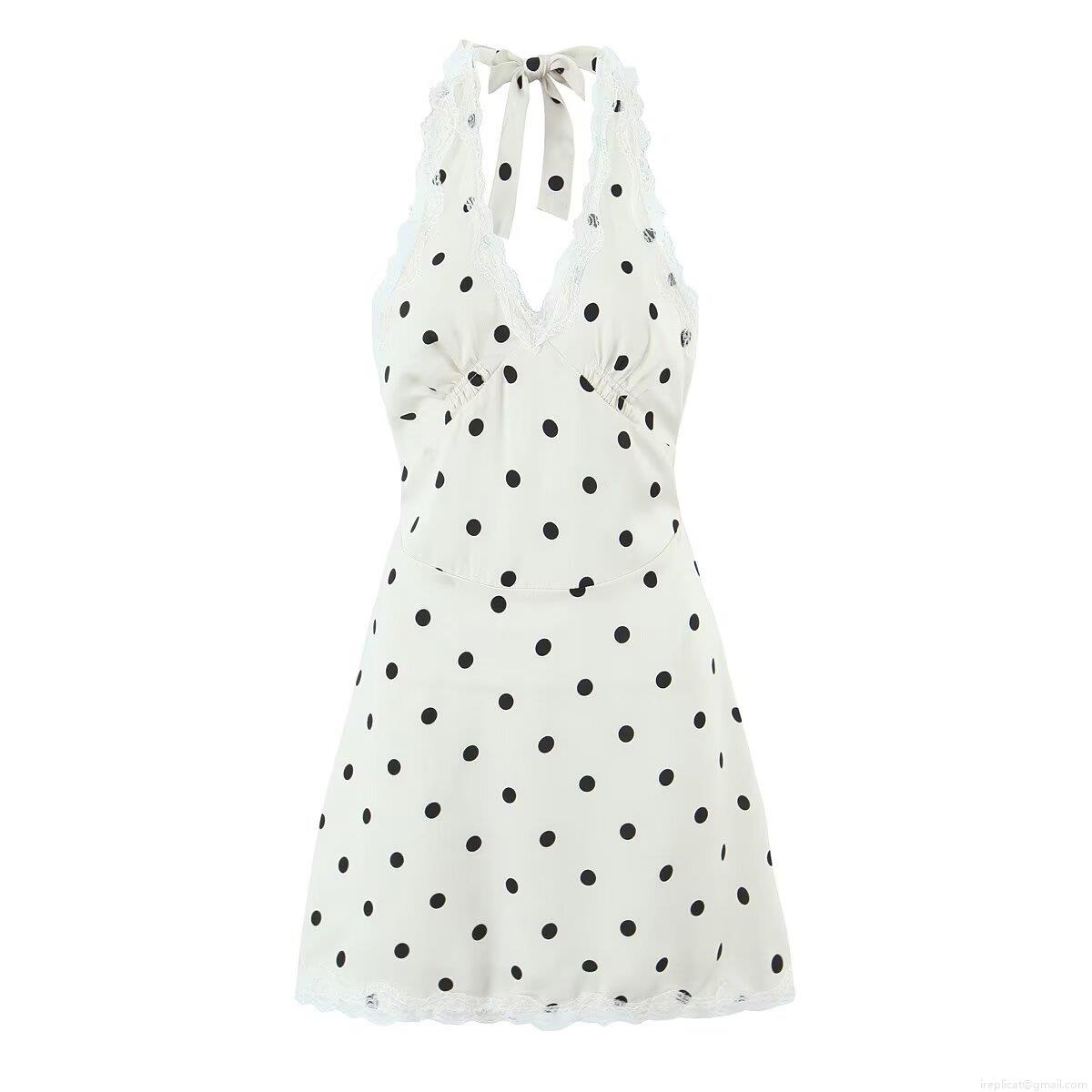 Women Halter Neck Polka Dot Mini Dress Lace Patchwork Sexy Backless Sleeveless A-Line Polyester Spandex Sundress Summer Party Fashion
