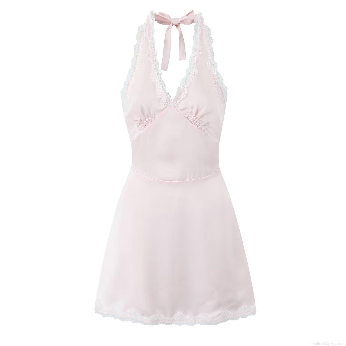 Halter Neck Strap, V-neck Lace Trim, The Skirt Has Lace Trim.