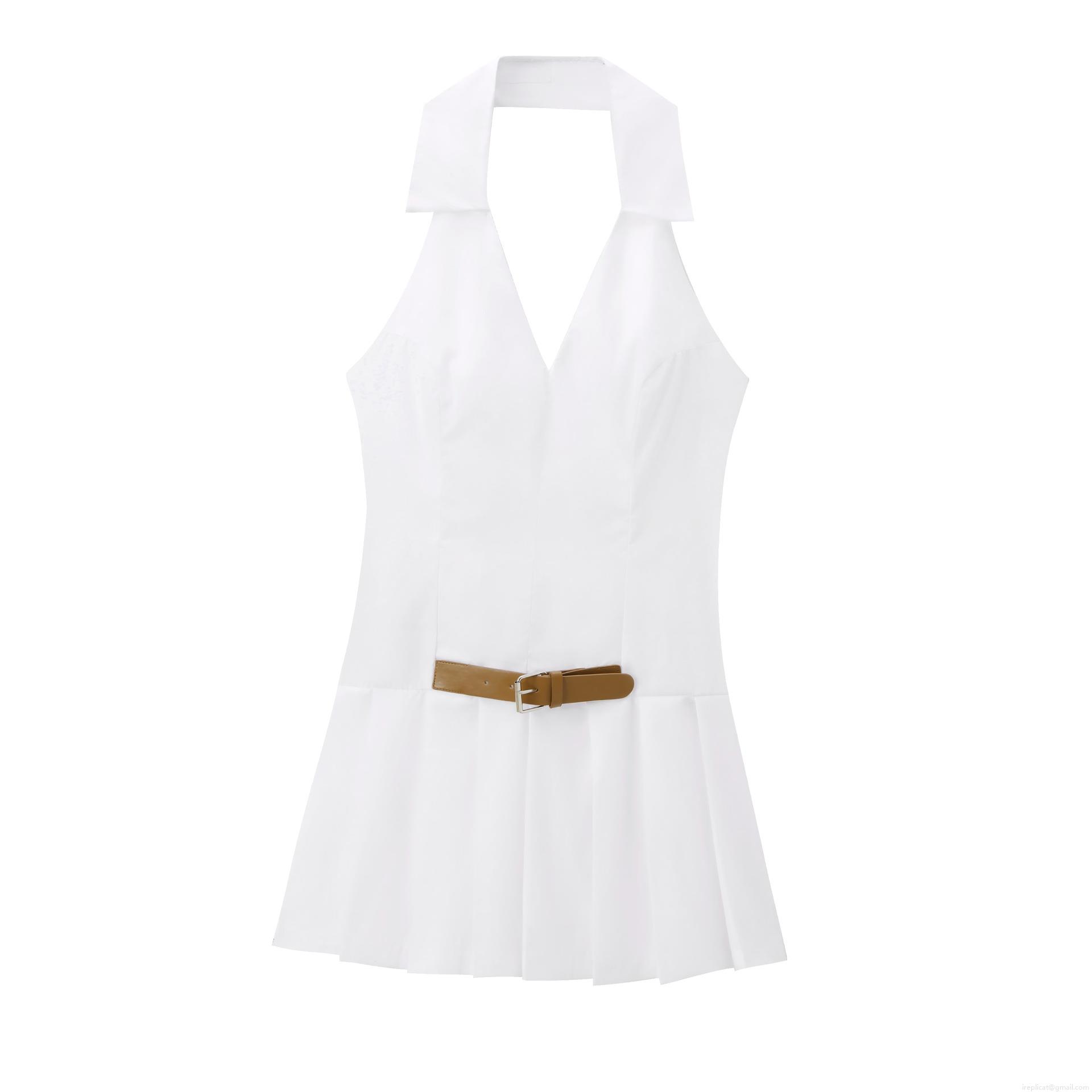 Women Halter Pleated Mini Dress With Brown Belt Backless V-Neck TC Cotton Blend Sleeveless Short Dress For Party Vacation Sexy Elegant Summer Dress