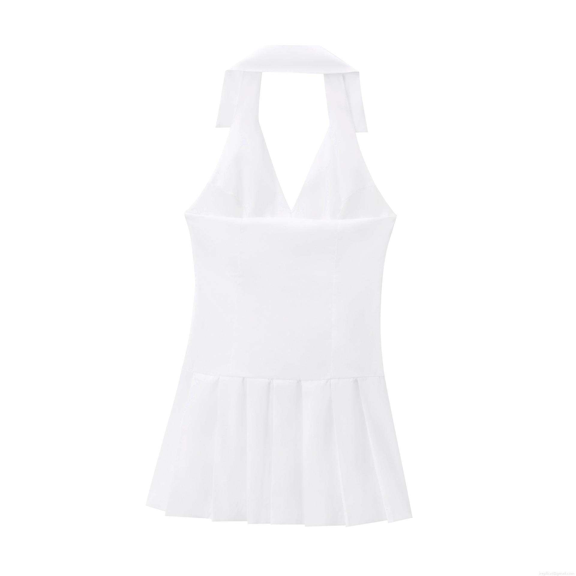 • Women Halter Pleated Mini Dress With Brown Belt Backless V-Neck TC Cotton Blend Sleeveless Short Dress For Party Vacation Sexy Elegant Summer Dress