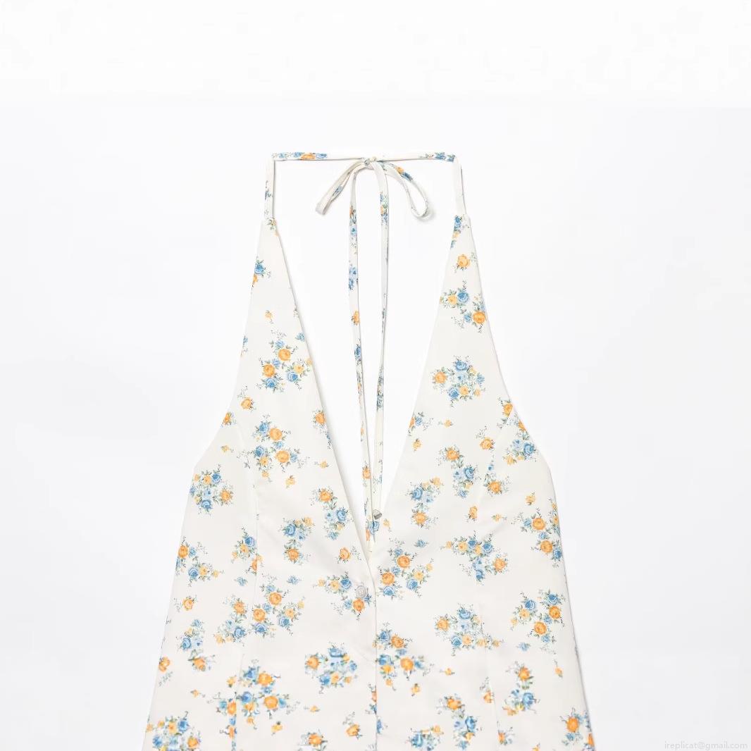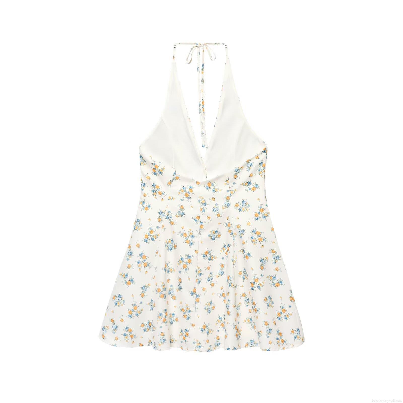 • Women Halter V Neck Backless Floral Print Mini Dress Summer Polyester Button Front A-Line Sundress For Vacation Party