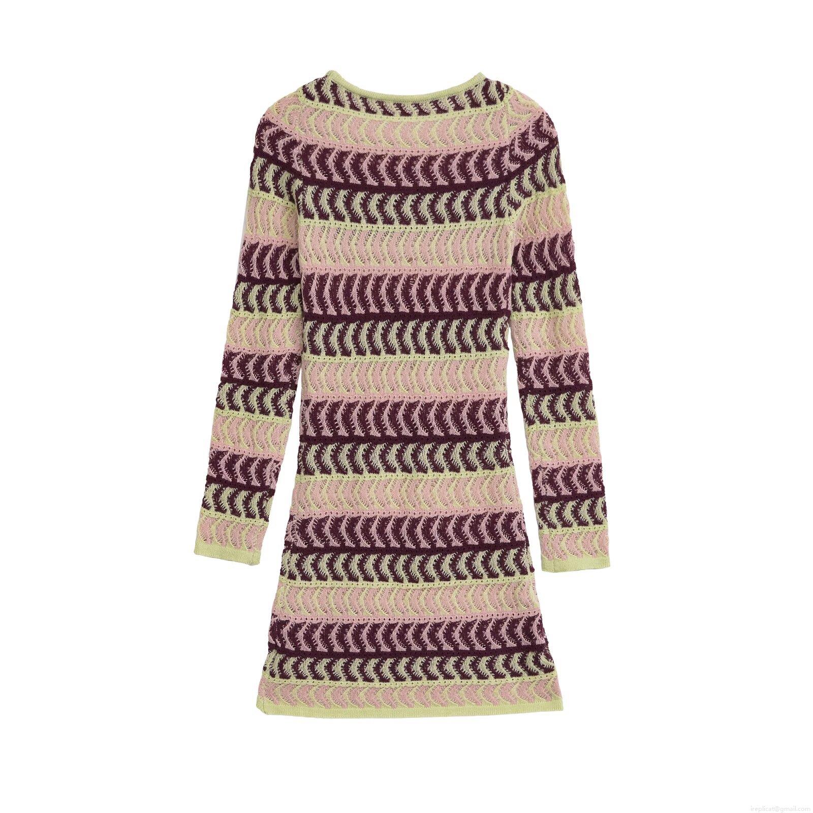 Women Long Sleeve Knit Dress Wavy Striped Colorblock Round Neck Mini Bodycon Dress Summer Casual Streetwear Polyester Knitted Short Dress