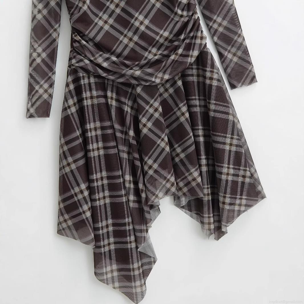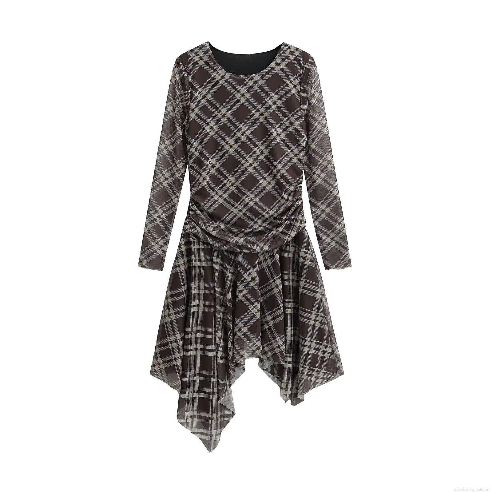 Women Mesh Plaid Long Sleeve Ruched Mini Dress Elegant Asymmetrical Hem Crew Neck Bodycon Sexy Party Clubwear Mesh Dress