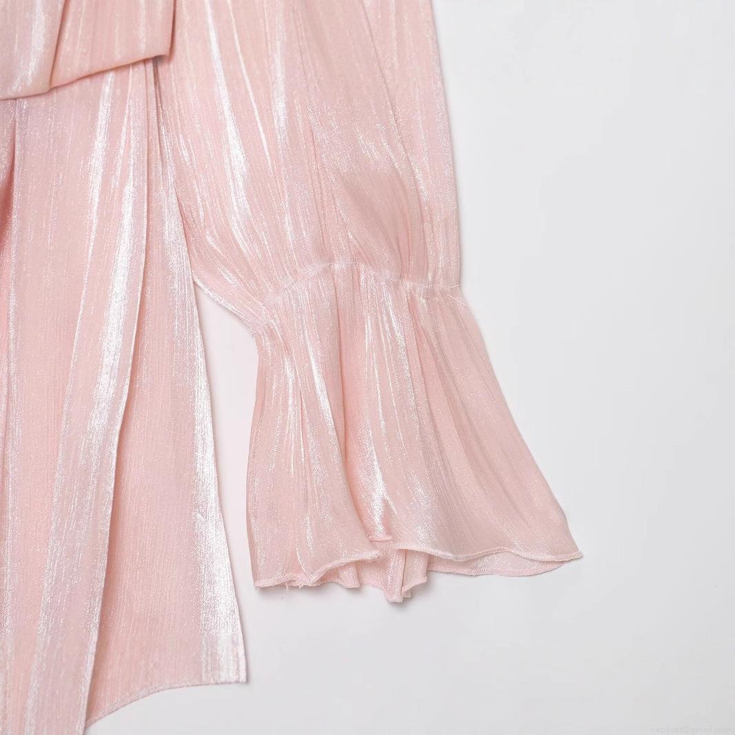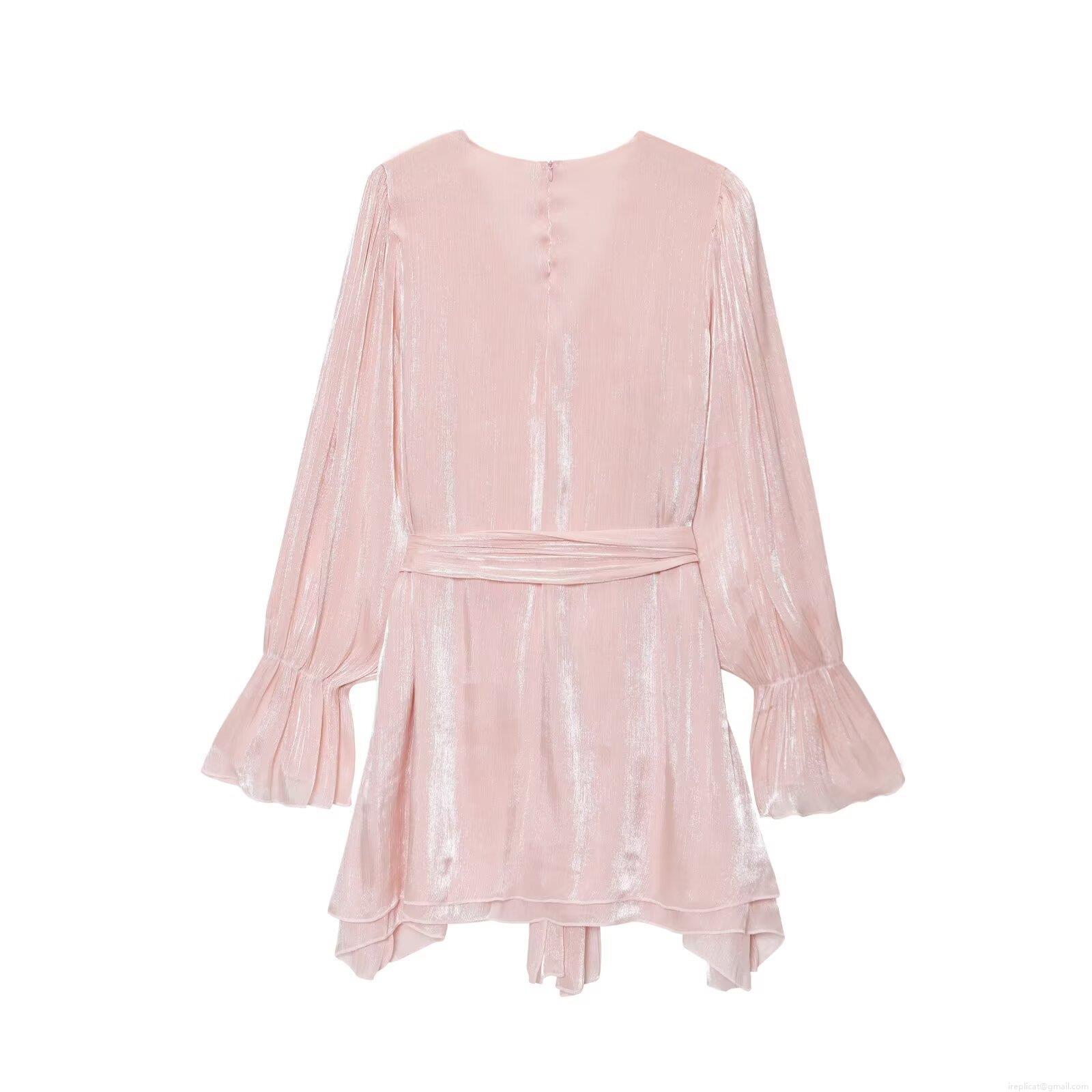 • Women Metallic Shiny Pleated Mini Dress V-Neck Long Sleeve Tie Waist Irregular Hem Ruffle Cuff Party Night Out Sexy Club Dress