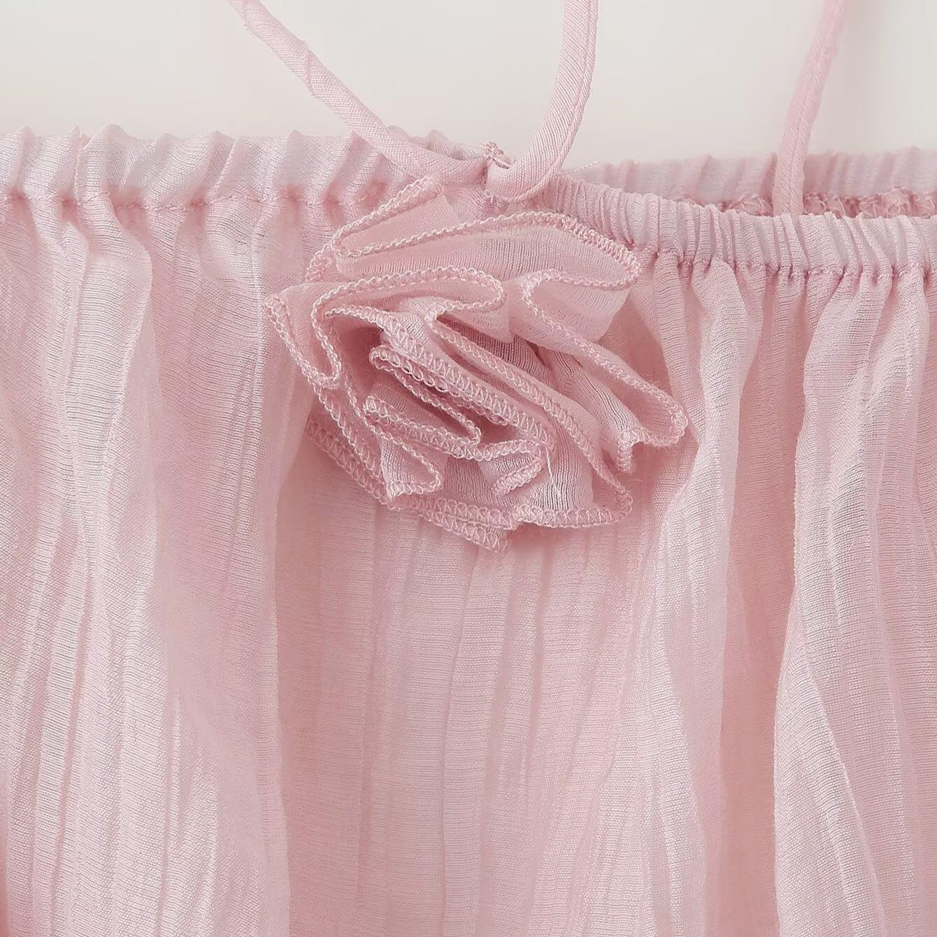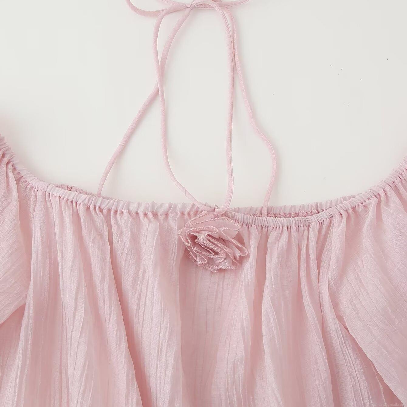 • Women Pink Ruffle Mini Dress Elegant 3D Flower Pleated Texture See-through Chiffon Off Shoulder Long Sleeve Party Dress