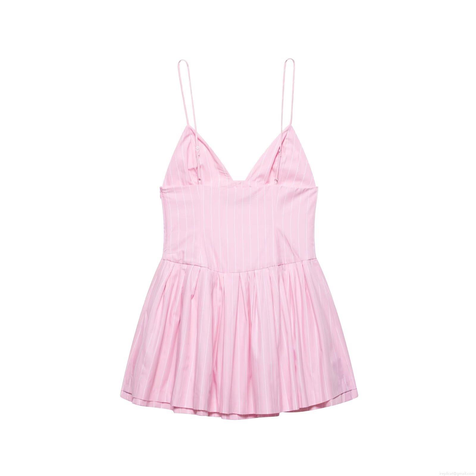 • Women Pink White Striped Cami Mini Dress With Bow Knot V-Neck Pleated Hem Sleeveless Polyester Blend Elegant Short Sundress For Dating Summer