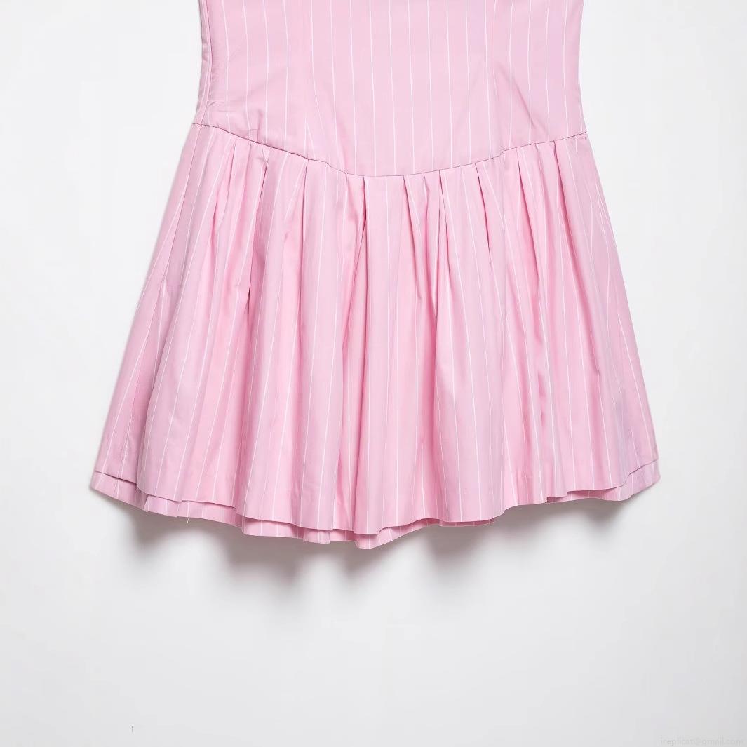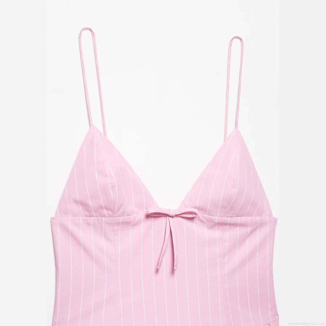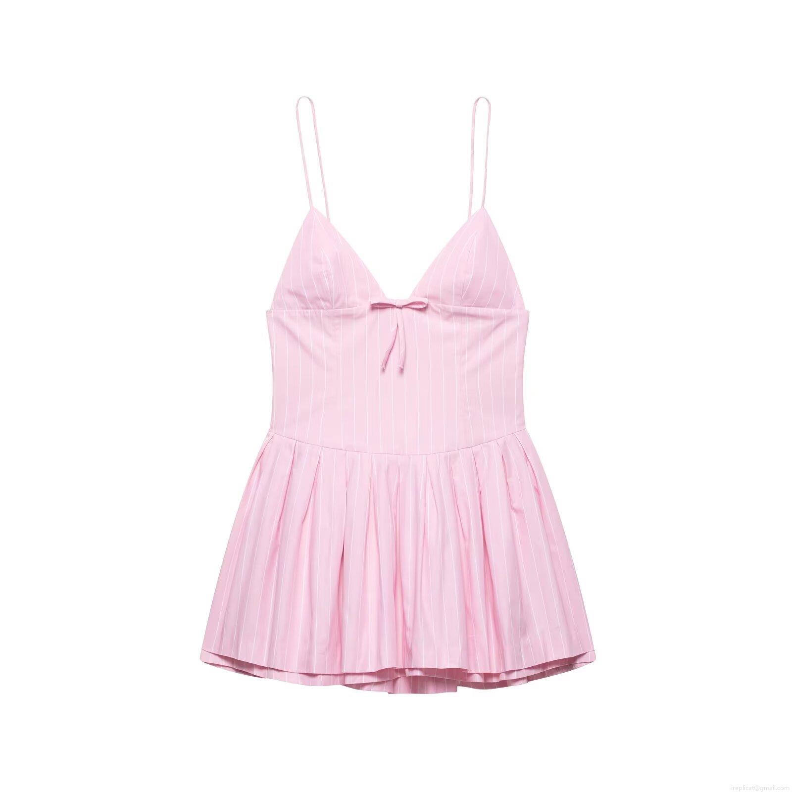 Women Pink White Striped Cami Mini Dress With Bow Knot V-Neck Pleated Hem Sleeveless Polyester Blend Elegant Short Sundress For Dating Summer