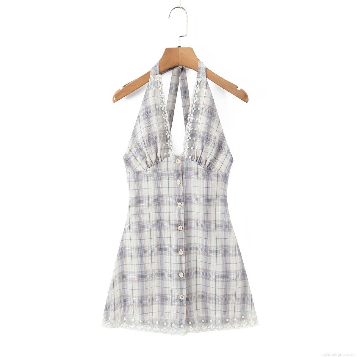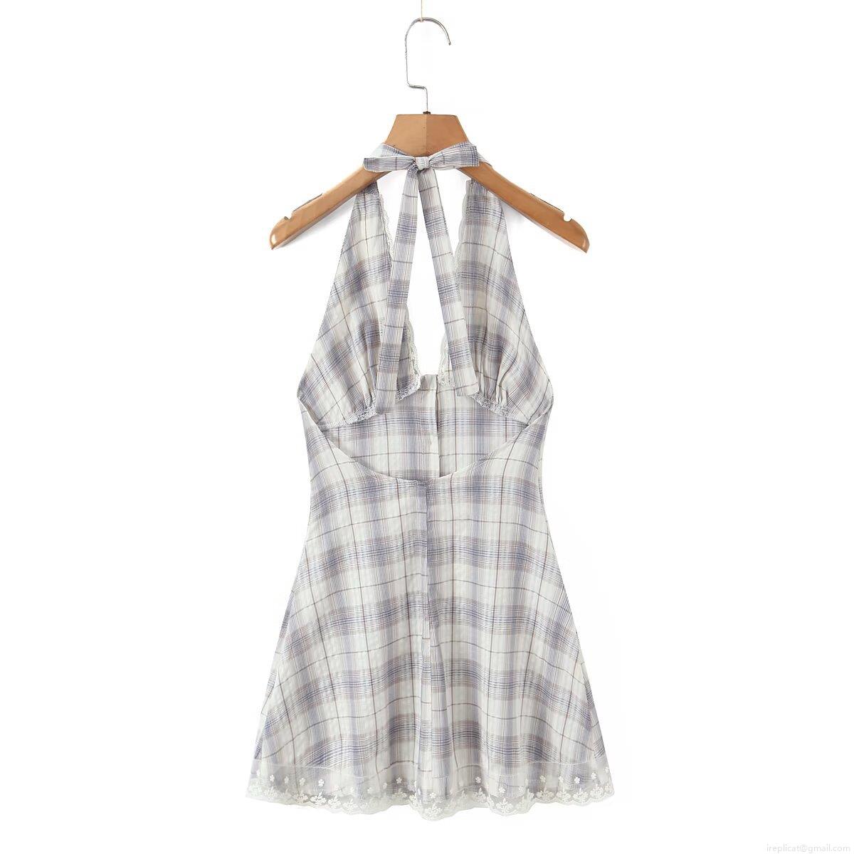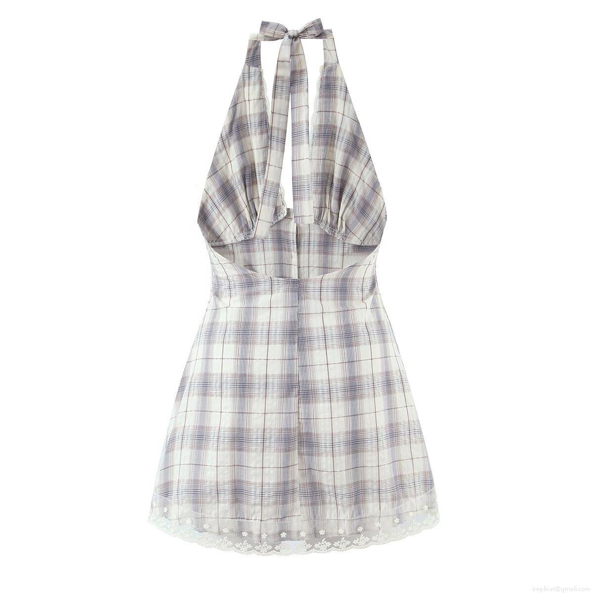 • Women Plaid Halter Backless Mini Dress Sexy V Neck Lace Trim Button Down A-Line Short Dress Summer Party Clubwear Fashion Cotton Outfit