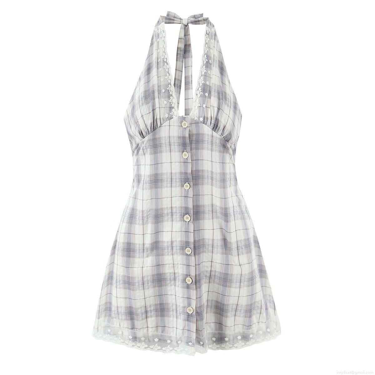 Women Plaid Halter Backless Mini Dress Sexy V Neck Lace Trim Button Down A-Line Short Dress Summer Party Clubwear Fashion Cotton Outfit