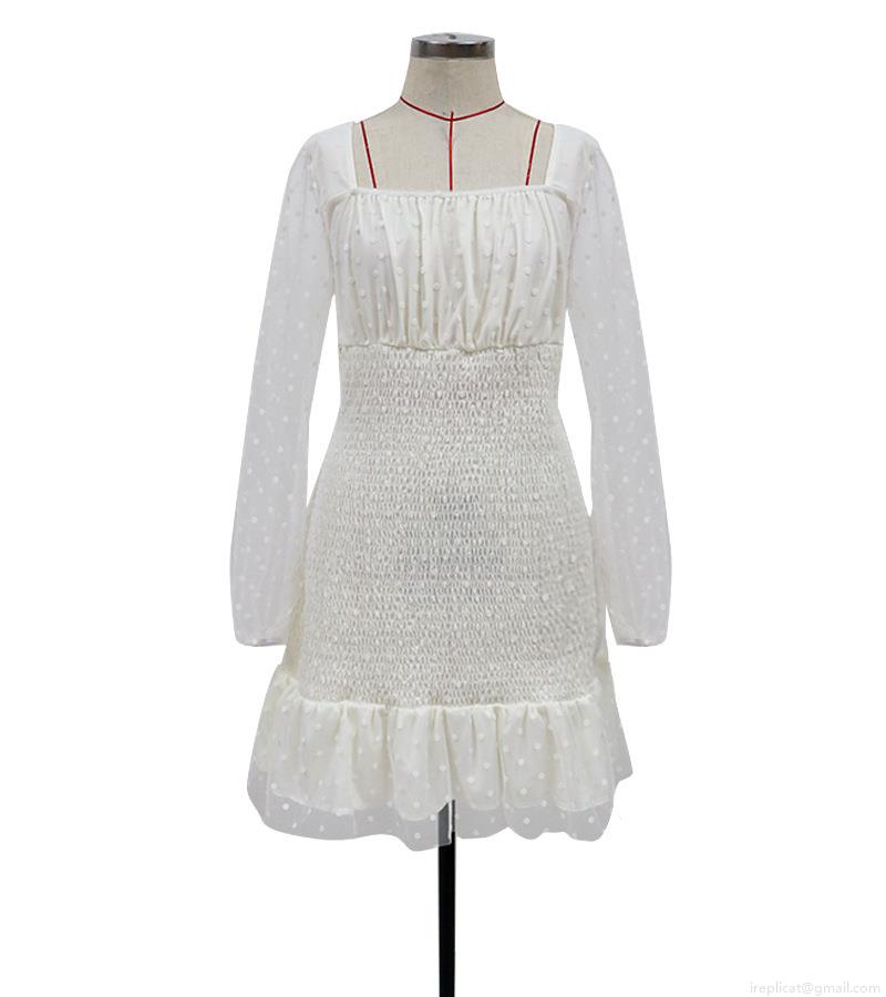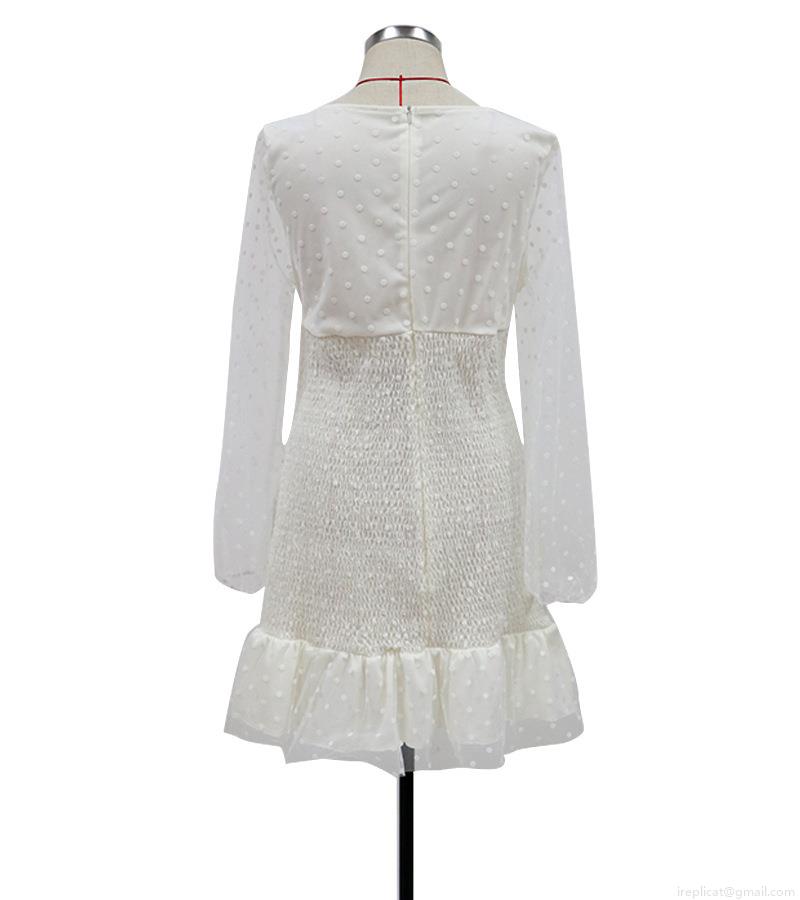 • Women Polka Dot Mesh Long Sleeve Mini Dress Polyester Smocked Bodycon Dress Ruffle Hem Square Neck Sexy Slim Fit Short Dress For Party Dating Club Night Out Beige