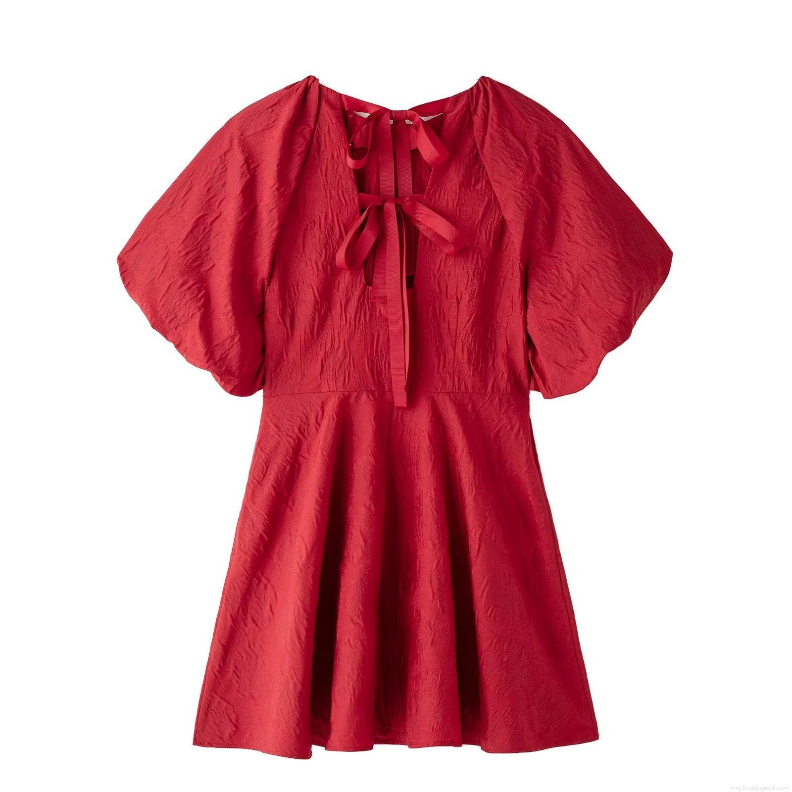 • Women Red Puff Sleeve Mini Dress Polyester Textured Backless Bow Tie Elegant A-Line Short Dress for Women Christmas Party Wedding Guest Prom Holiday Sweet Clothing