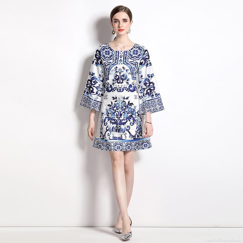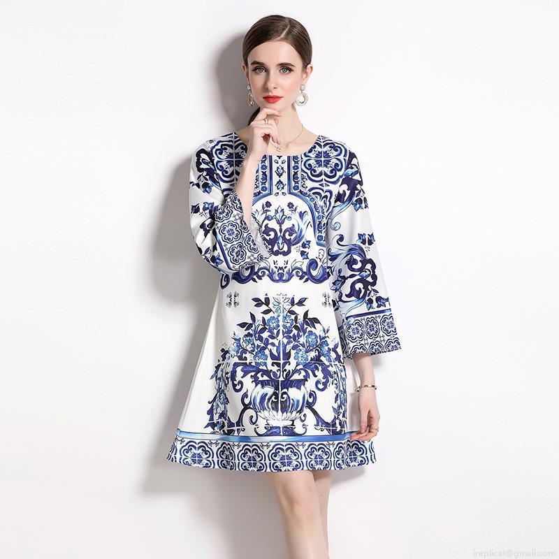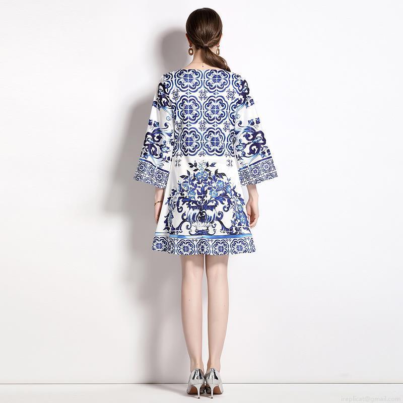 • Women Round Neck Flare Sleeve Blue and White Porcelain Print Dress Elegant A-Line Mini Dress Polyester Party Evening Slim Fit Short Dress for Ladies