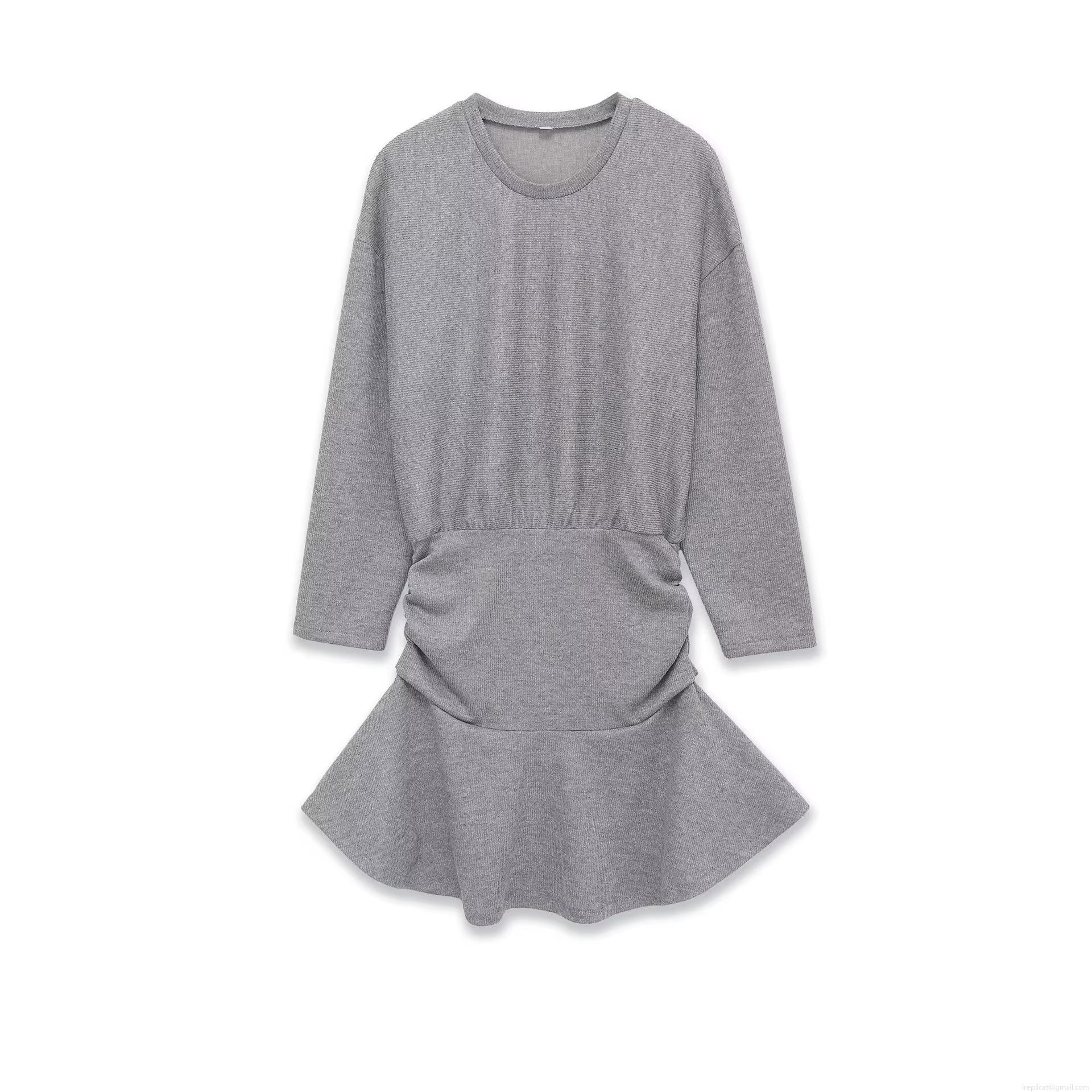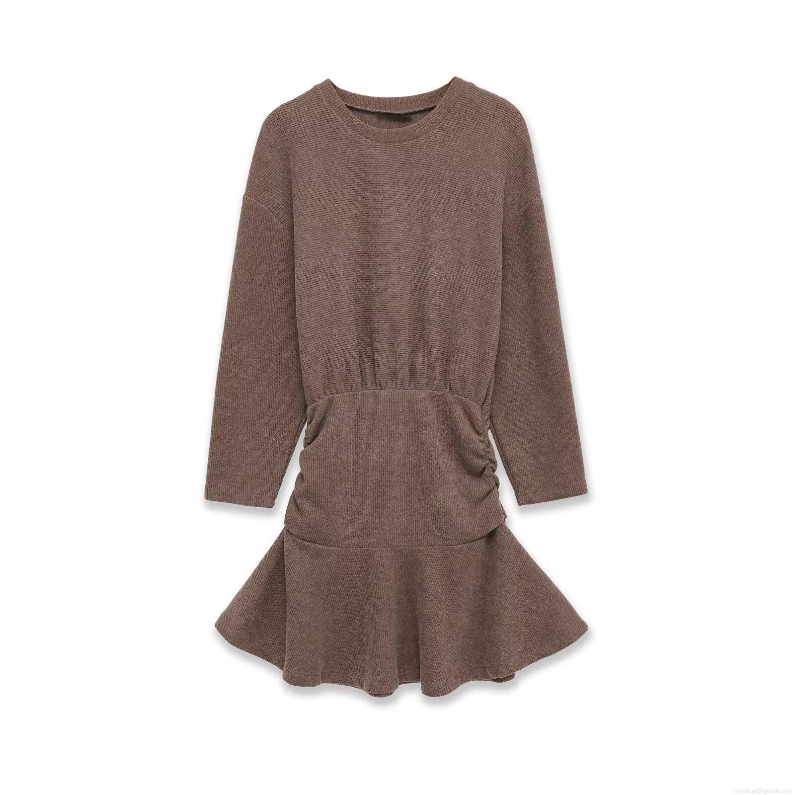 • Women Round Neck Long Sleeve Knit Mini Dress With Ruffle Hem Solid Color Ribbed Bodycon Casual Soft Sweater Dress For Daily Fall Winter Grey Camel