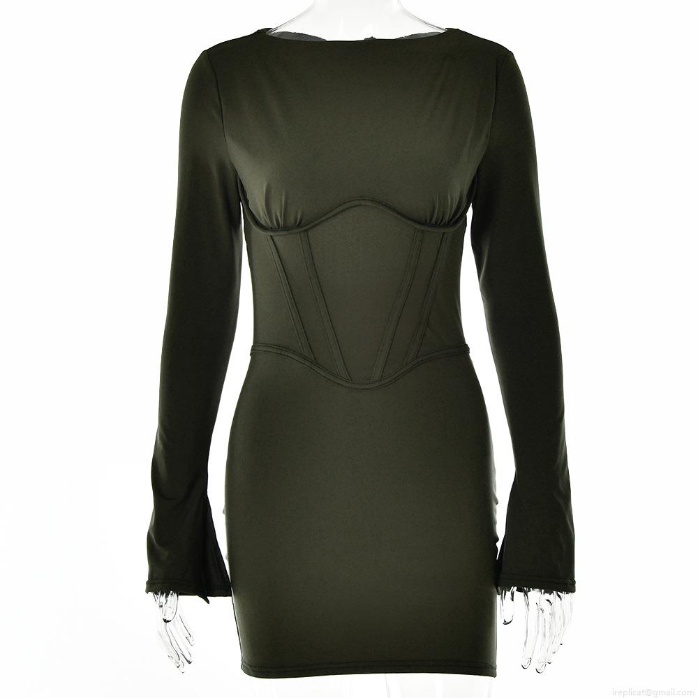 • Women Sexy Backless Bodycon Mini Dress Long Sleeve Round Neck Waist Corset Fishbone Polyester Slim Fit Fall Clubwear Party Dress For Women