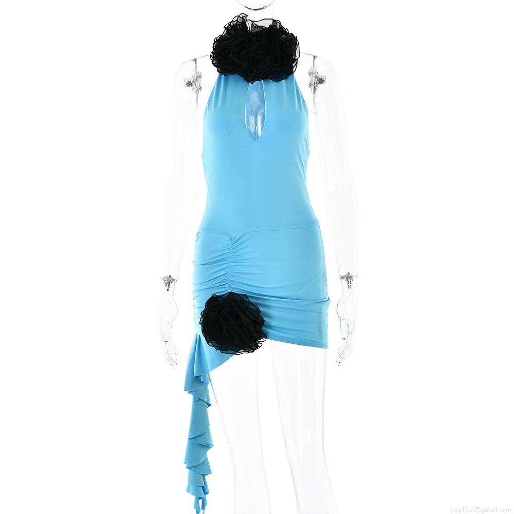 • Women Sexy Backless Halterneck Bodycon Mini Dress With 3D Flower Decor V-Neck Asymmetric Ruffle Hem Hollow Out Party Club Dress