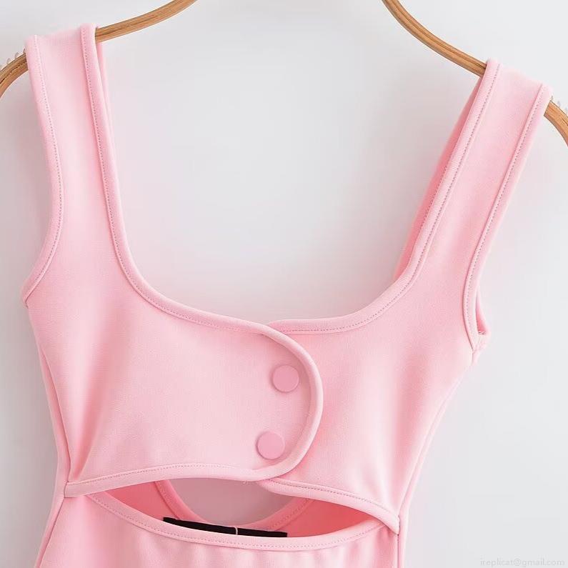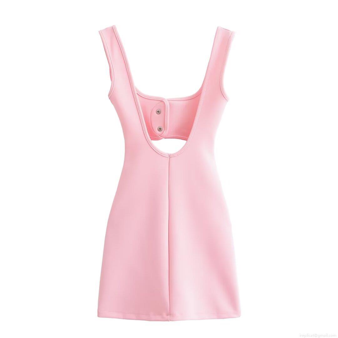 • Women Sexy Backless Mini Dress Pink Square Neck Sleeveless Elastic Bodycon Dress Cutout Waist Button Decor Summer Party Club Wear For Lady