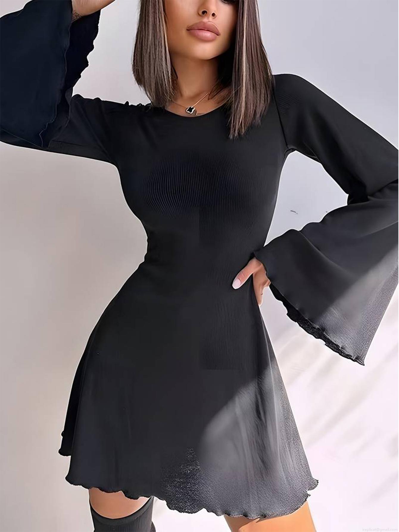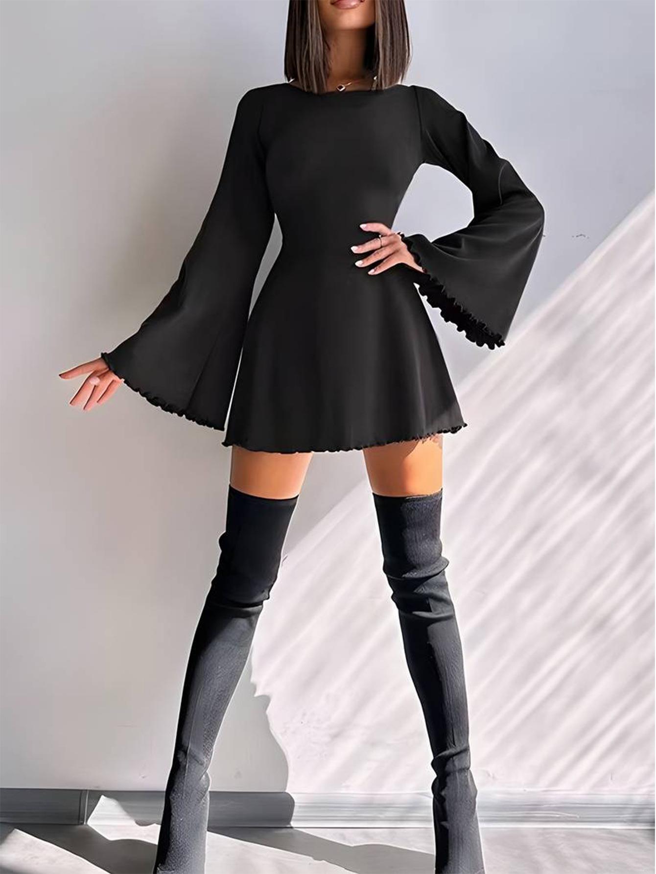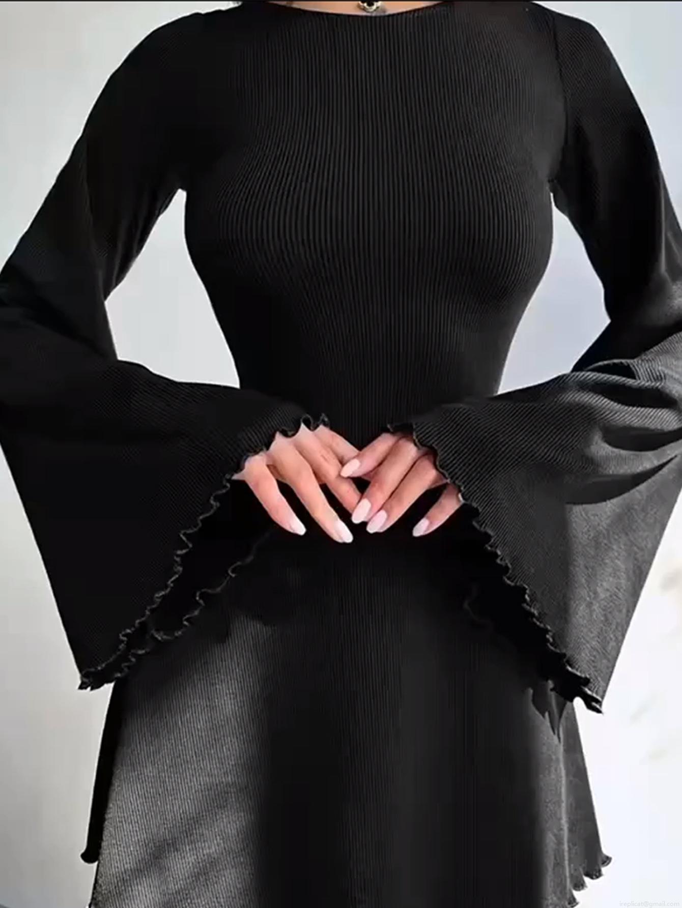 • Women Sexy Bell Sleeve Knit Mini Dress Backless Lace Up Ruffle Hem Slim Fit Long Sleeve Ribbed Party Dress Elegant Solid Black Polyester Elastane Dress
