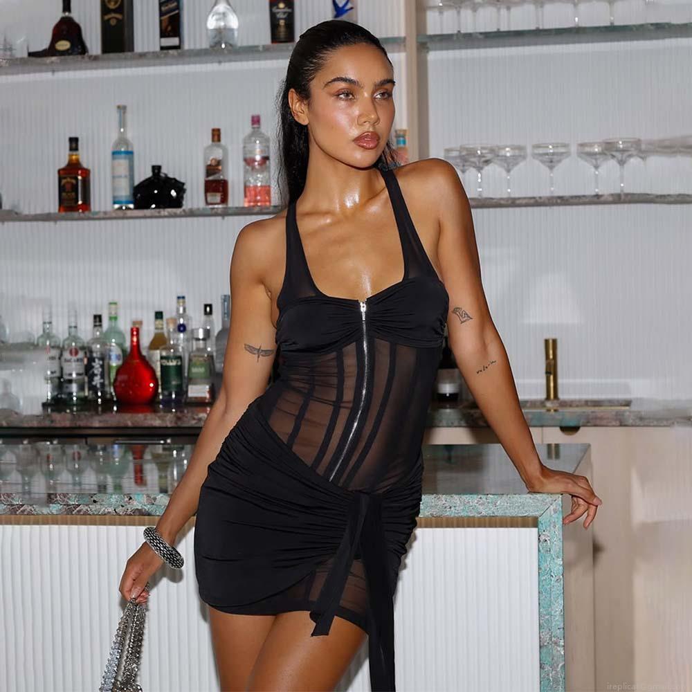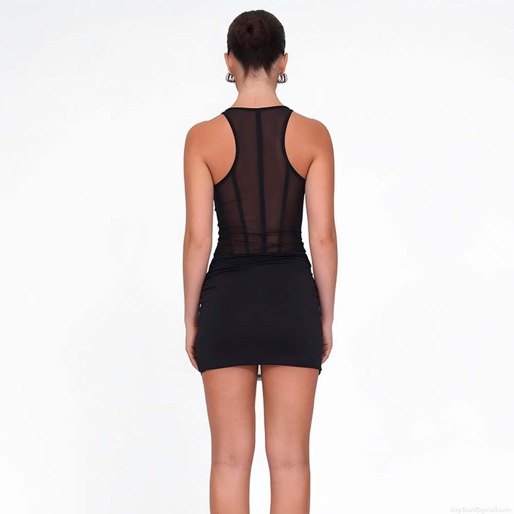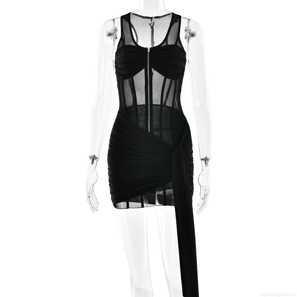 • Women Sexy Black Mini Dress Mesh Patchwork Zipper Bodycon Ruched Clubwear Party Sleeveless Square Neck Polyester Milk Silk Dress For Women Summer Streetwear