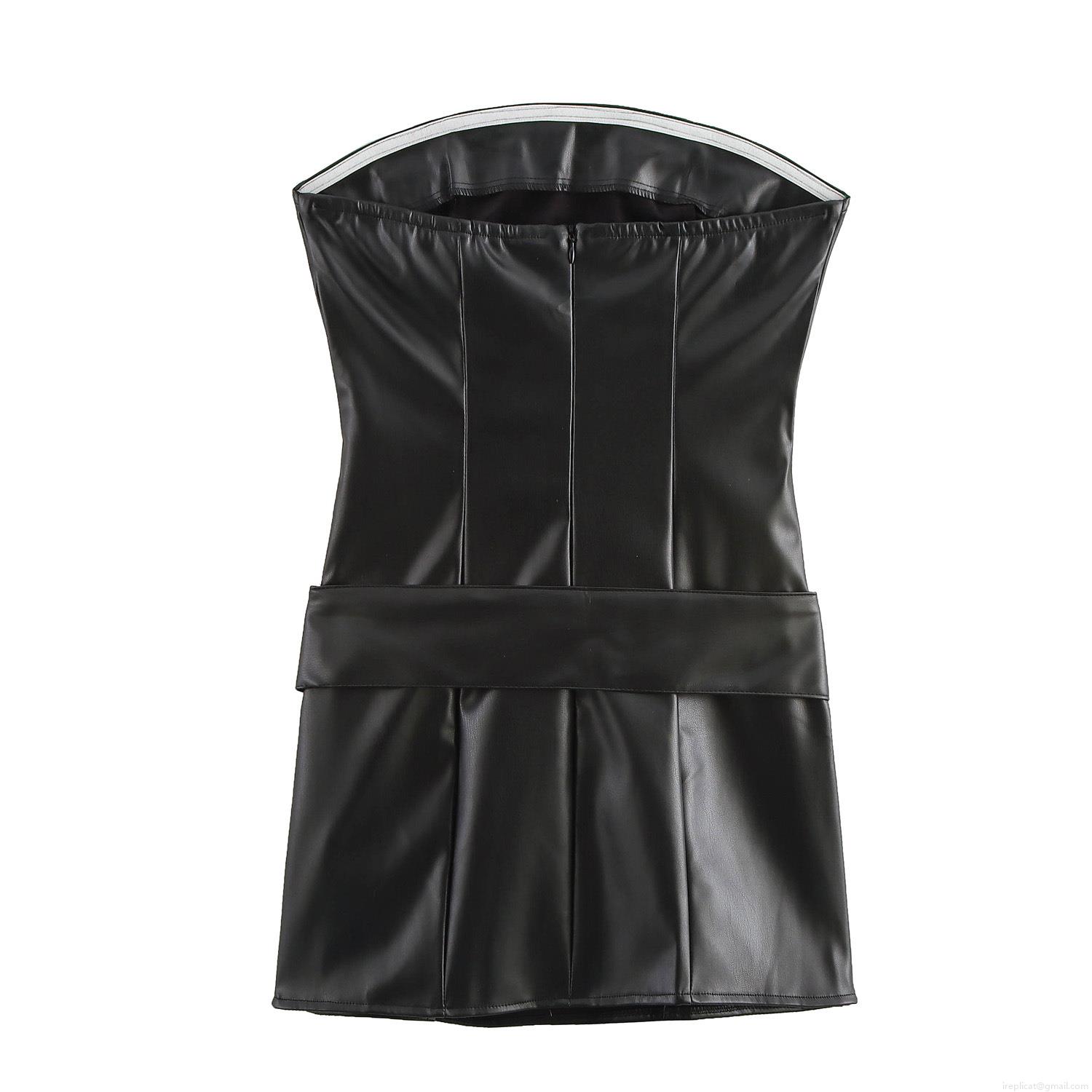 • Women Sexy Black PU Leather Strapless Mini Dress with Wide Belt Gold Buckle Sleeveless Bodycon Slim Fit Party Club Evening Dress for Women Fashion Outfits