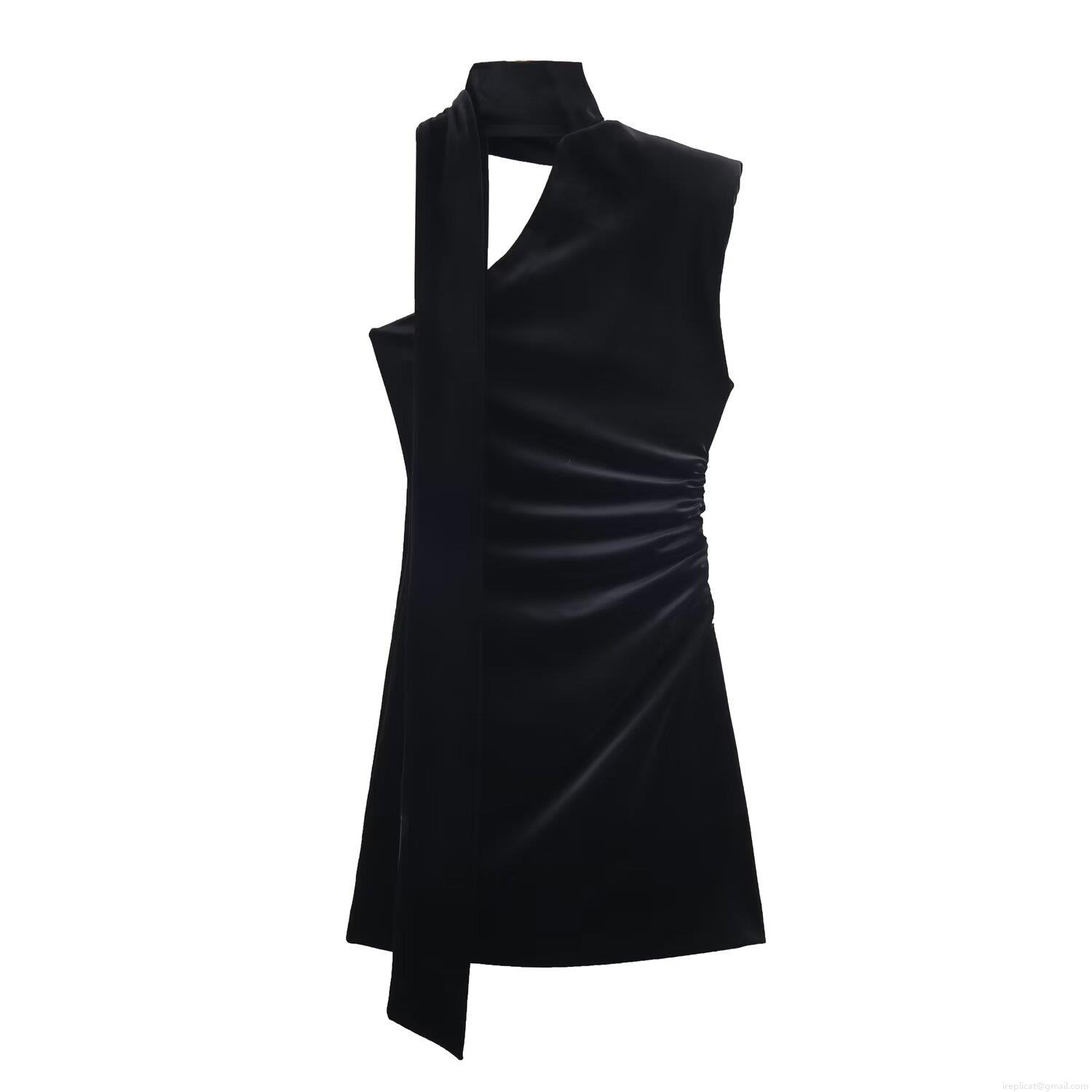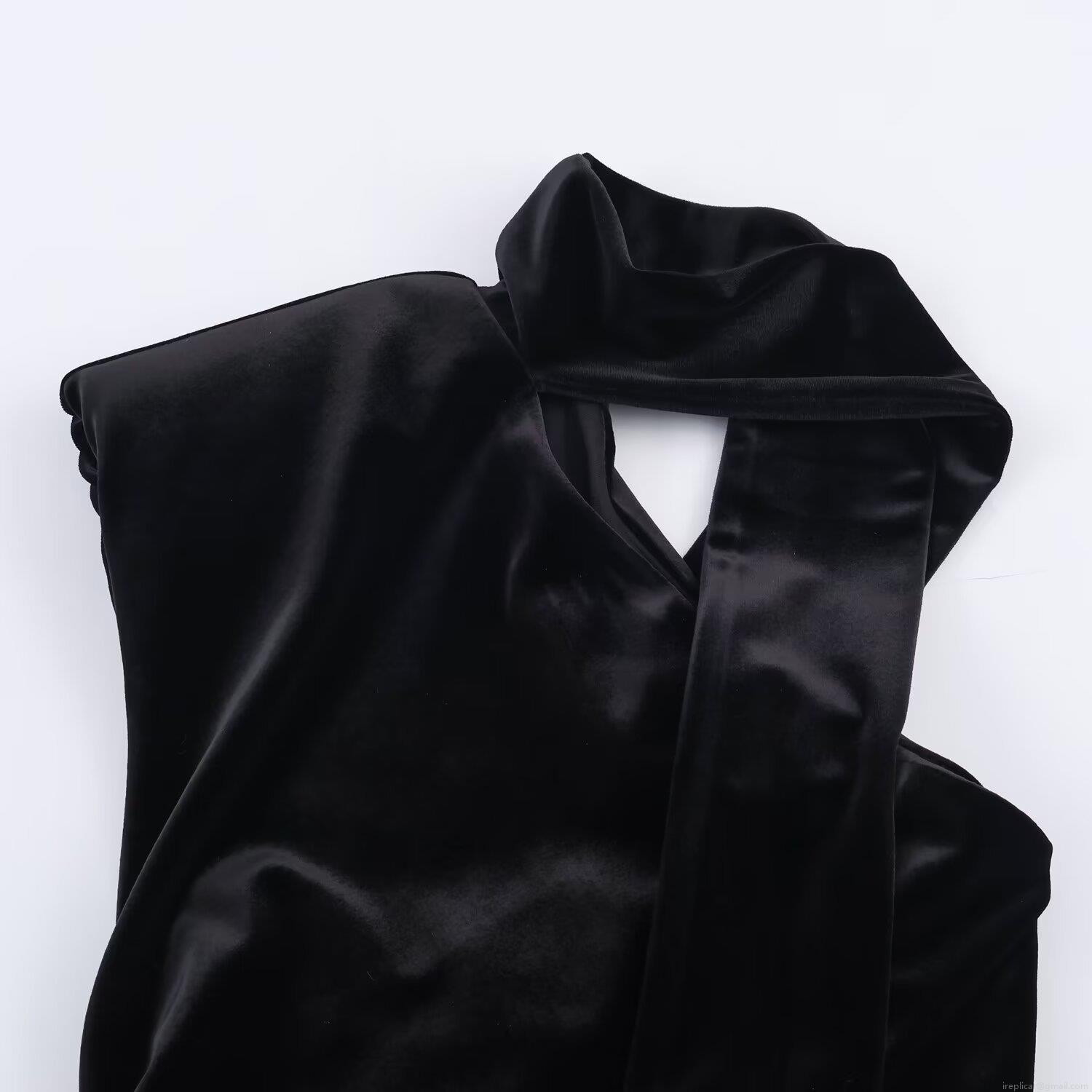 • Women Sexy Black Velvet Mini Dress Sleeveless Asymmetric Neck Scarf Trim Ruched Bodycon Party Clubwear Elegant Evening Short Dress For Women