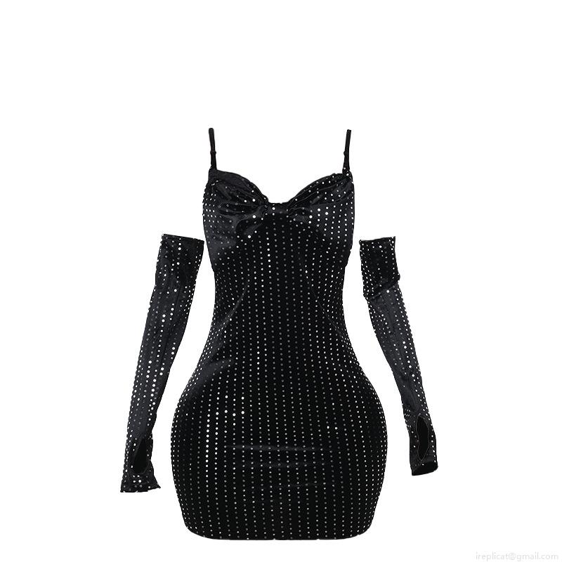 • Women Sexy Black Velvet Sequin Bodycon Mini Dress Set With Matching Long Gloves Sparkling Bow Spaghetti Strap Party Evening Clubwear Dress