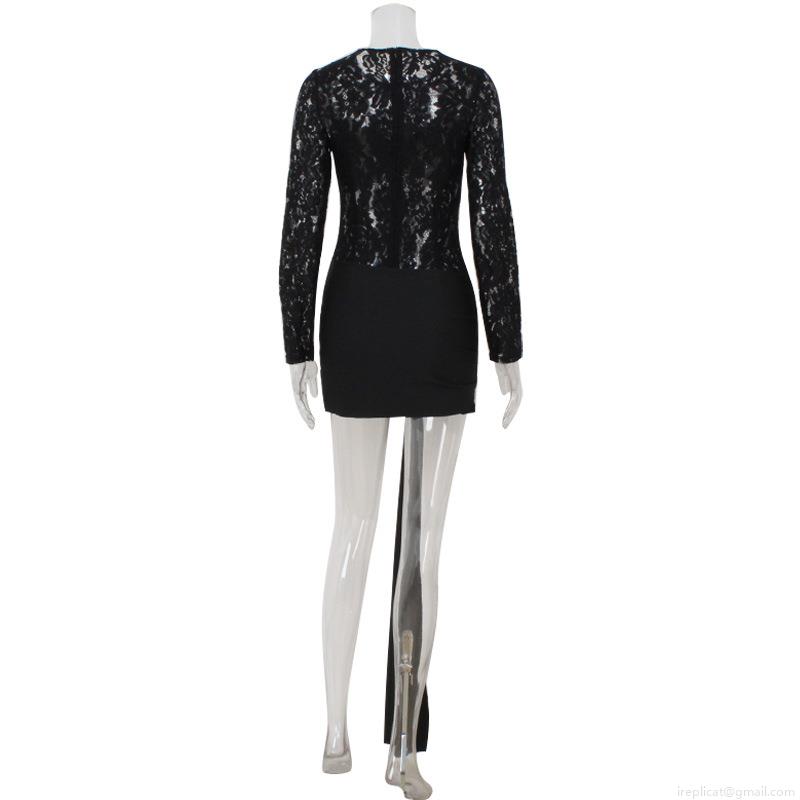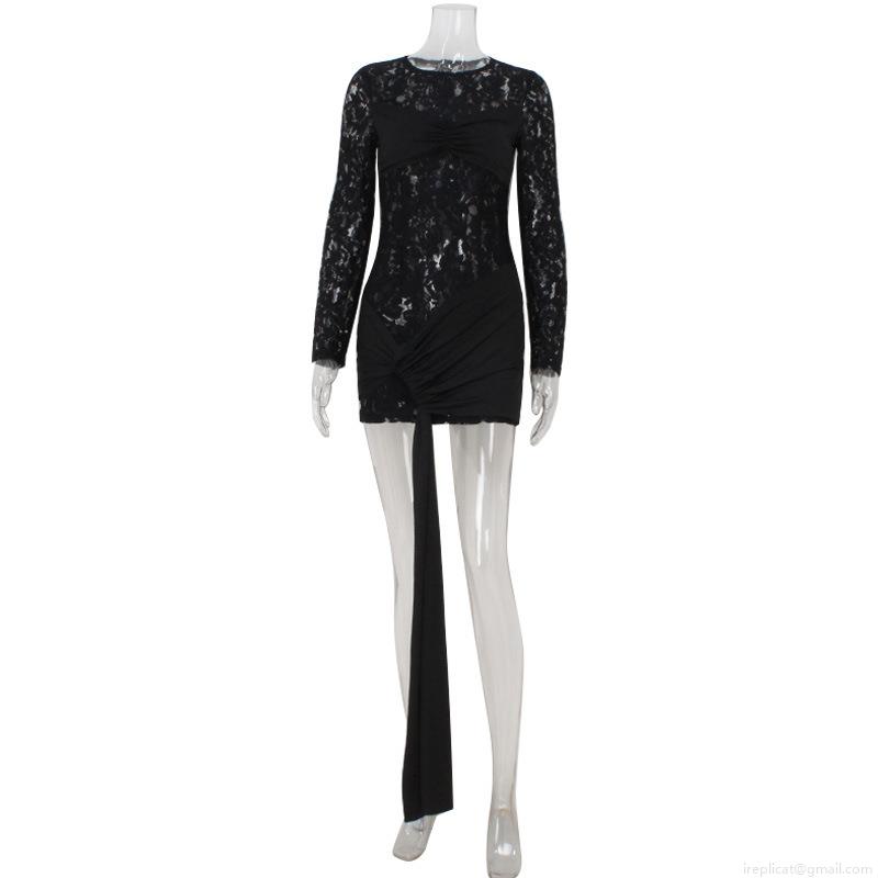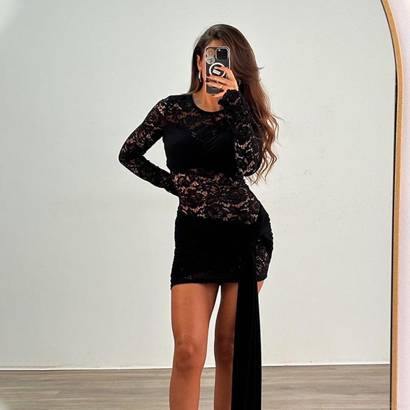 • Women Sexy Bodycon Mini Dress Black Lace Patchwork Long Sleeve Tie Waist Slim Fit Socialite Style Evening Party Night Club Outfits