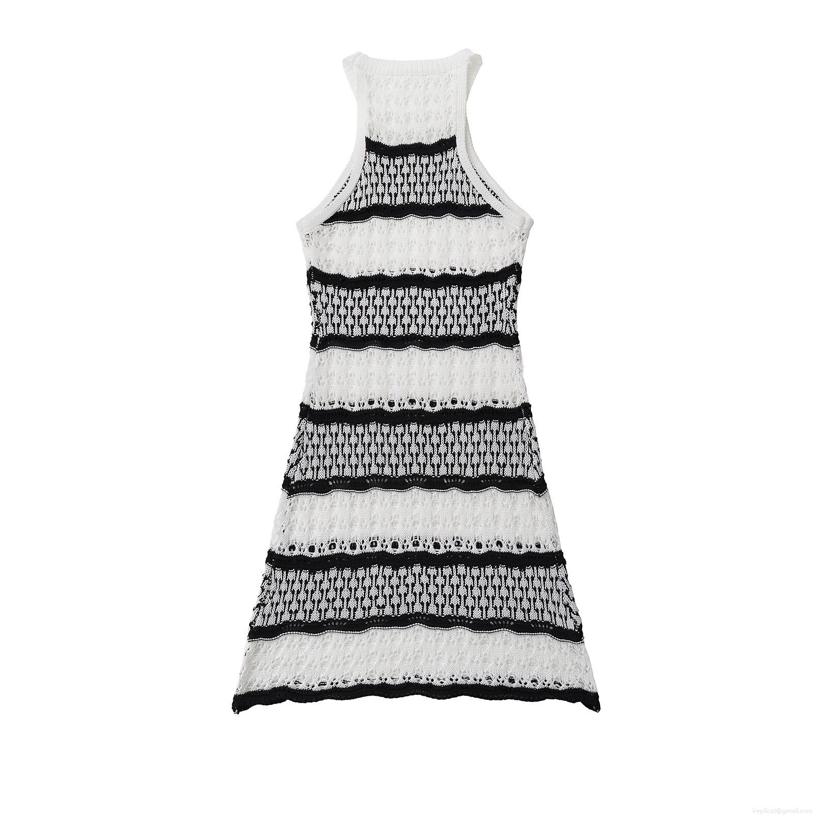 • Women Sexy Crochet Hollow Out Striped Mini Dress Sleeveless Round Neck Colorblock Knitted Tank Dress For Summer Beach Vacation Party Streetwear