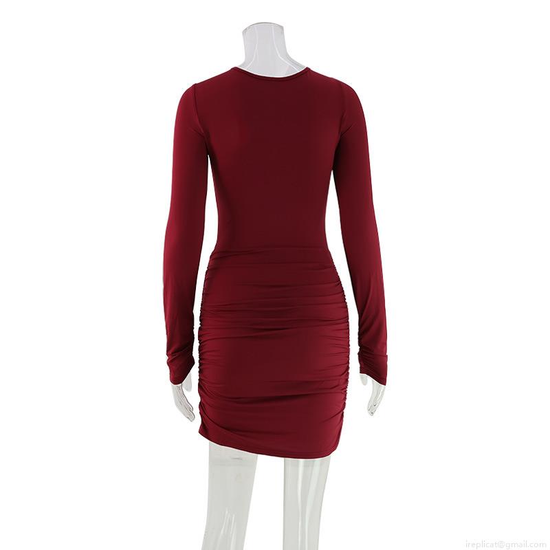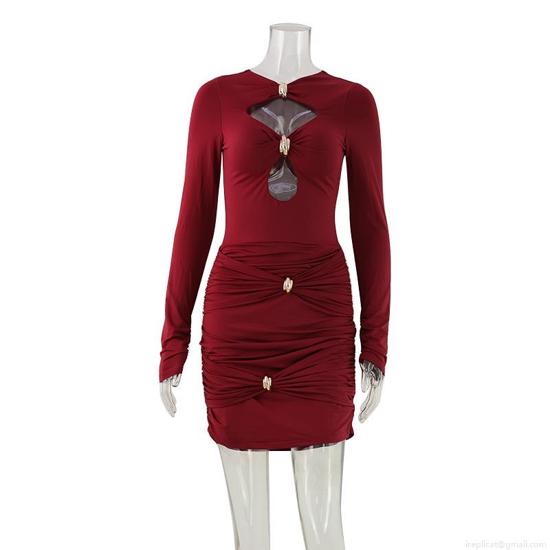 • Women Sexy Cut-out Long Sleeve Mini Dress Polyester Spandex Ruched Bodycon Dress With Metal Buckle High Waist Short Skirt For Party Night Club