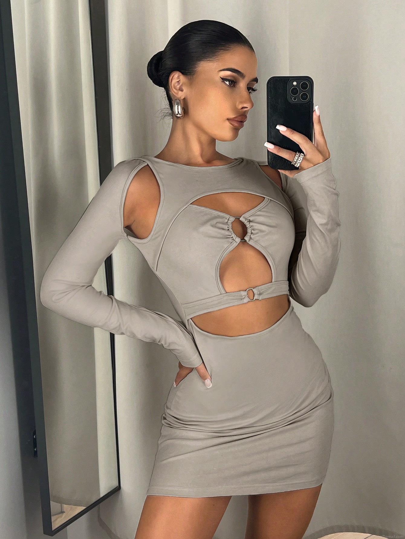 Women Sexy Cutout Mini Dress Long Sleeve Bodycon Dress Polyester Spandex Milk Silk Slim Fit Clubwear Party Dress with Metal Ring Detail