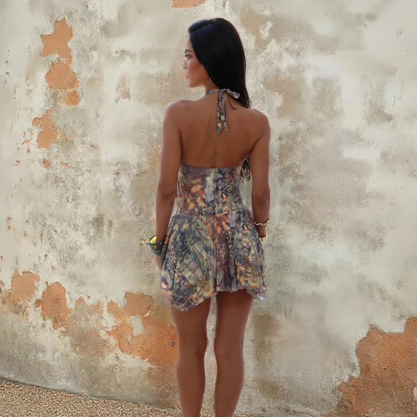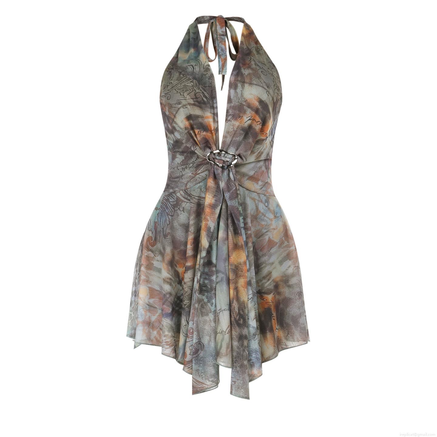 • Women Sexy Deep V Neck Halter Backless Dress Bohemian Abstract Print Mesh Mini Dress Irregular Hem Sleeveless Vacation Beach Party Club Dress