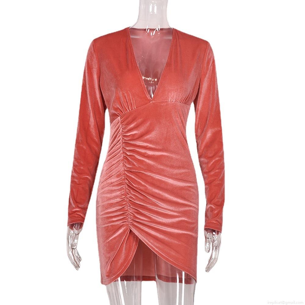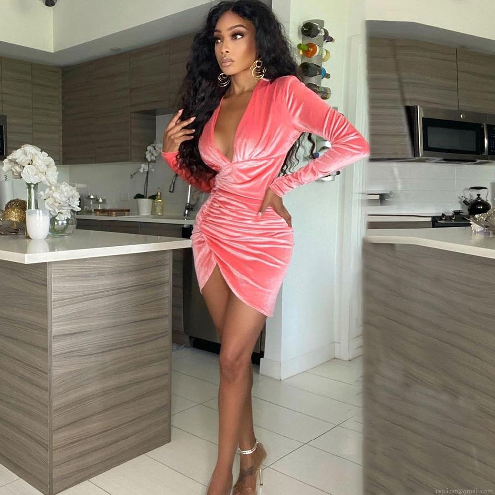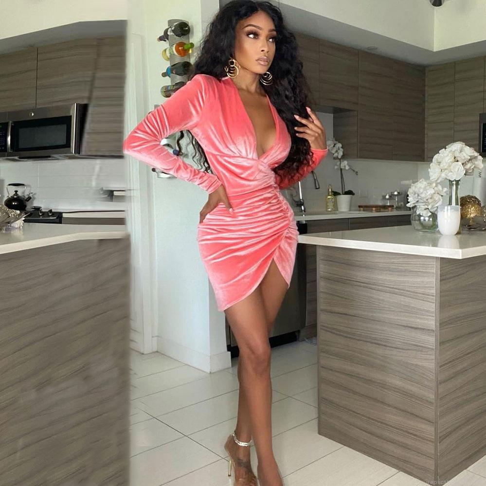 • Women Sexy Deep V Neck Long Sleeve Silk Velvet Ruched Mini Dress Slim Fit Drawstring Bodycon Party Cocktail Clubwear Evening Dress For Autumn Winter